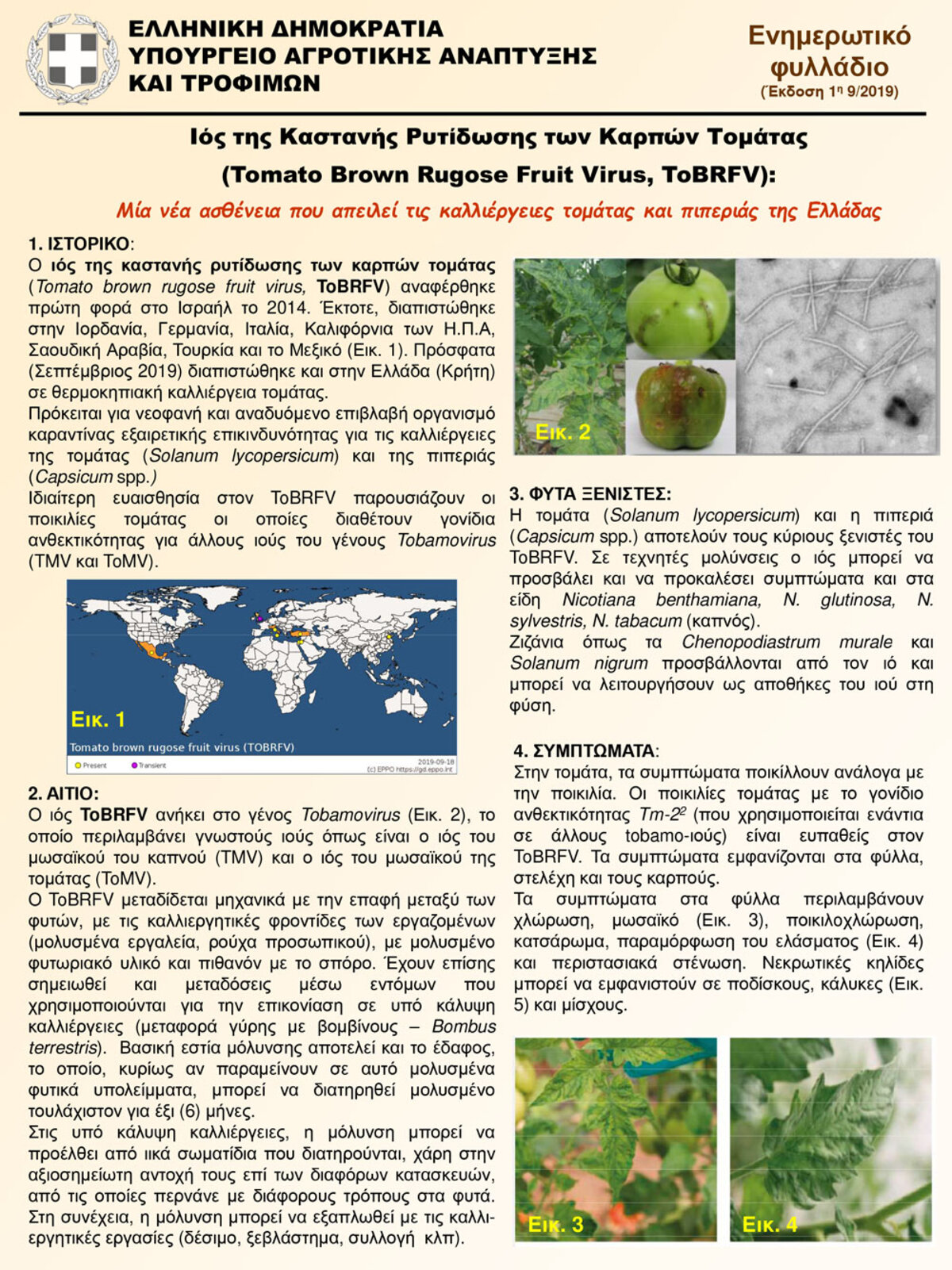 Η Διεύθυνση Αγροτικής Οικονομίας και Κτηνιατρής της Περιφερειακής Ενότητας Λασιθίου ενημερώνει πως έχει επιβεβαιωθεί η παρουσία του ιού της καστανής ρυτίδωσης των καρπών της τομάτας (ToBRFv) σε πολλές χώρες της ΕΕ, όπως στην Ολλανδία, στη Γερμανία, στη Γαλλία, στην Ιταλία, στην Ισπανία, αλλά και στην χώρα μας, στις ΠΕ Χανίων και Μεσσηνίας.