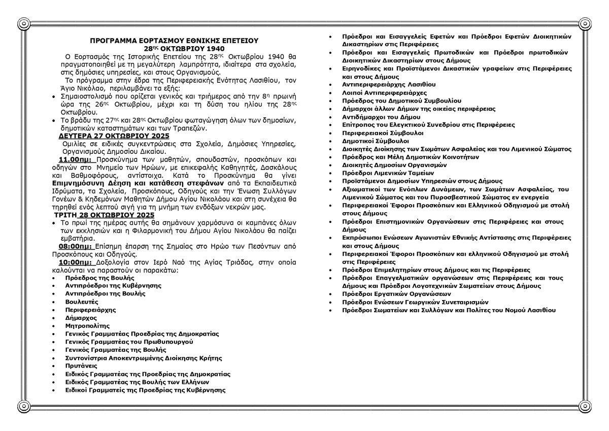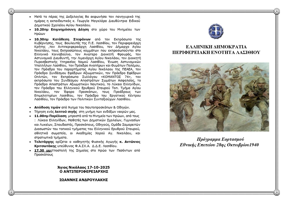 Πρόσκληση του Αντιπεριφερειάρχη Λασιθίου στον Εορτασμό της 28ης Οκτωβρίου 1940