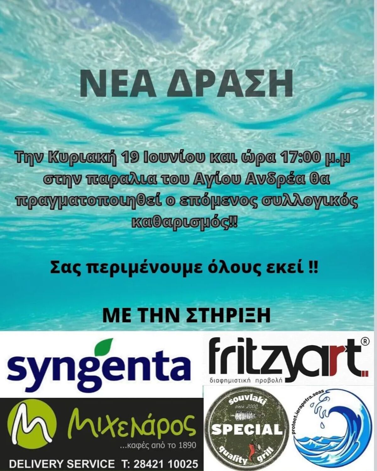 Έχουμε την χαρά να σας ανακοινώσουμε τον 2ο συλλογικό καθαρισμό στην παραλία του Αγίου Αντρέα την Κυριακή 19 Ιουνίου στις 17:00. Σας καλούμε όλους να παραβρεθείτε!! Η υπόθεση της προστασίας του περιβάλλοντος είναι καθήκον όλων μας.