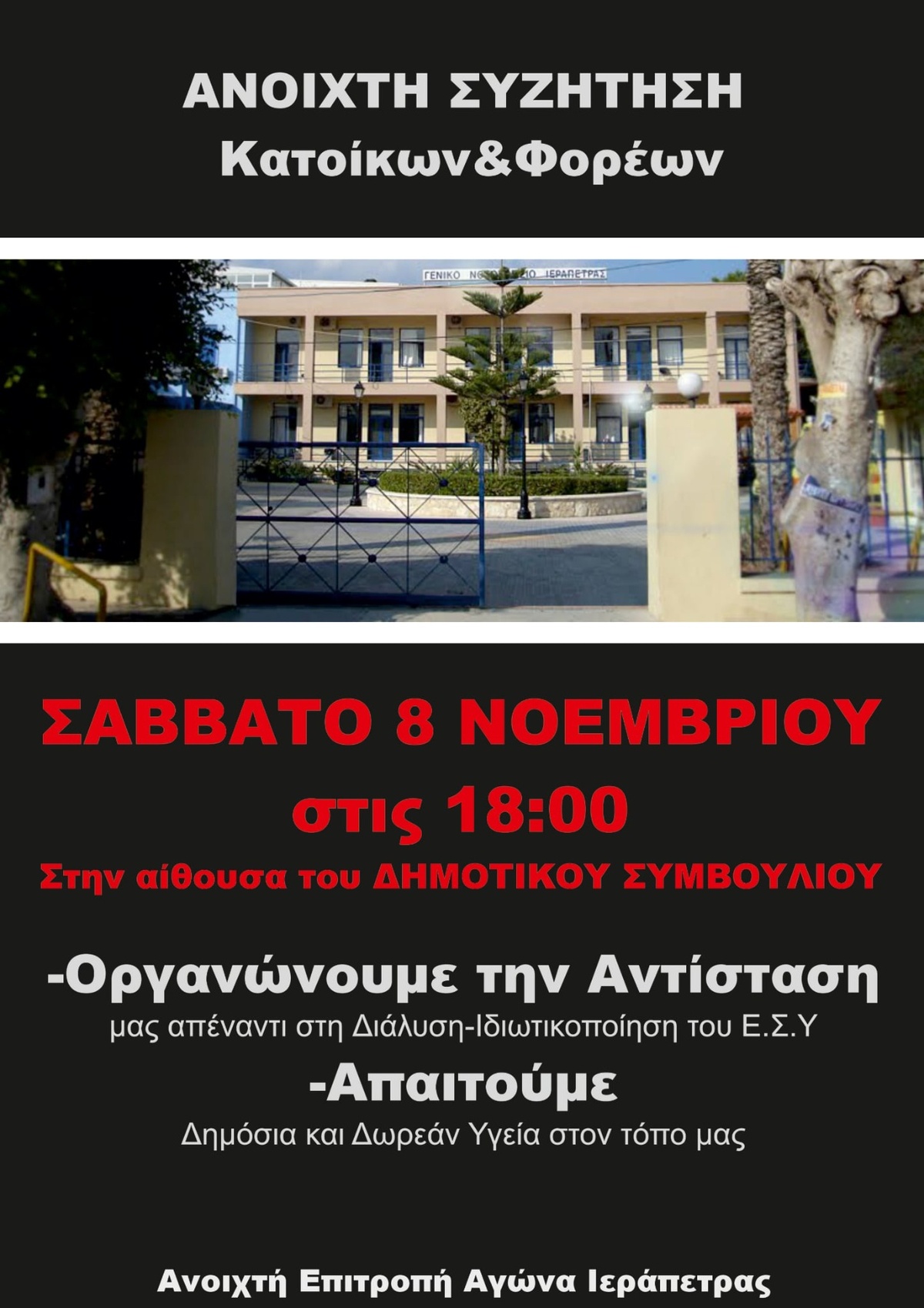 Η Επιτροπή Αγώνα Ιεράπετρας καλεί σε κοινό μέτωπο ενάντια στην ιδιωτικοποίηση του ΕΣΥ – Προετοιμασία για Παγκρήτιο συλλαλητήριο στα τέλη Νοεμβρίου.
