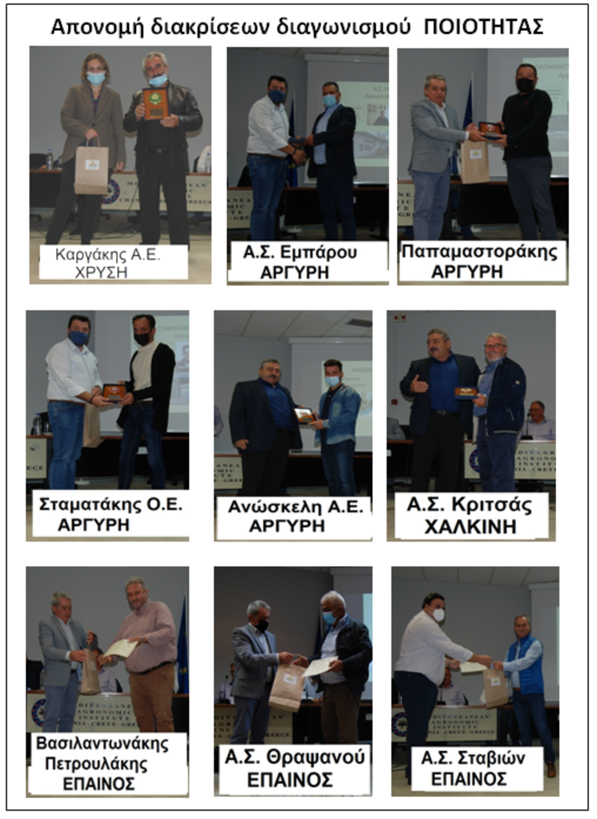 Στα πλαίσια της ημερίδας έγινε και η απονομή των Βραβεύσεων Ελαιοτριβείων που συμμετείχαν στους διαγωνισμούς Ποιότητας και Εμπορίας ελαιολάδου 2020/21 που είχε προκηρύξει ΣΕΔΗΚ κατά την οποία επιβραβεύτηκαν με πλακέτες της Χρυσής, Αργυρής και Χάλκινης Μινωικής Ελιάς και Επαίνους.