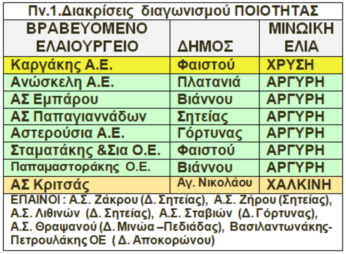 Με βαση τα χαρακτηριστικα αυτά καθοριστηκαν οι βραβευθεντες για την ποιοτητα όπως φαινονται στον Πιν.1.