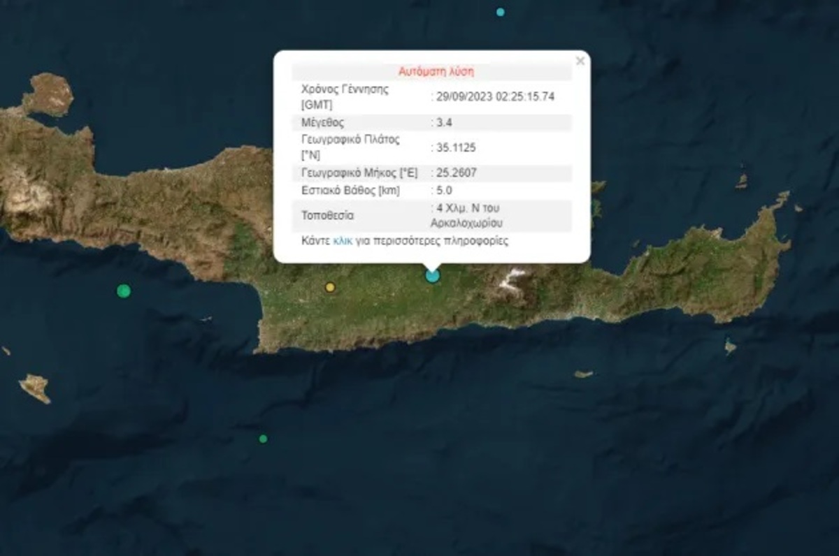 Σεισμική δόνηση 3,4 βαθμών της κλίμακας Ρίχτερ σημειώθηκε τα ξημερώματα της Παρασκευής 29 Σεπτεμβρίου, στο Αρκαλοχώρι.
