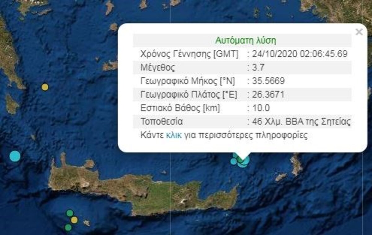 Σεισμική δόνηση μεγέθους 3,7 βαθμών της κλίμακας Ρίχτερ σημειώθηκε λίγα λεπτά μετά τις 5 τα ξημερώματα του Σαββάτου στον θαλάσσιο χώρο βορειοανατολικά της Σητείας
