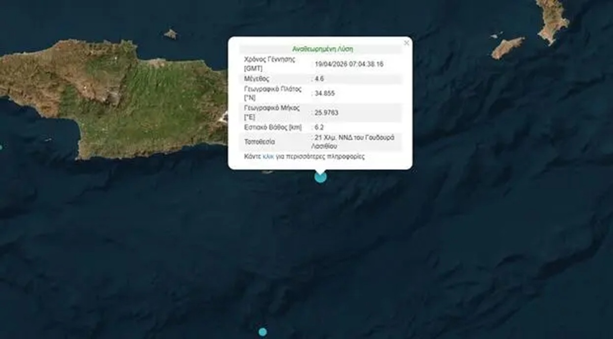 Μέγεθος 4,6 της Κλίμακας Ρίχτερ είχε ο σεισμός που σημειώθηκε το πρωί της Κυριακής, σε απόσταση 21 χιλιόμετρα νότια - νοτιοανατολικά του Γουδουρά Λασιθίου, στην Κρήτη.