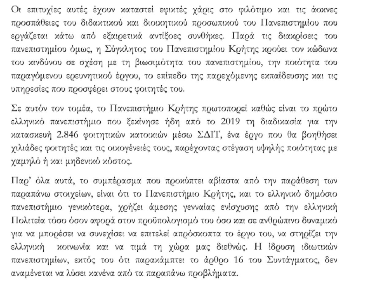 "Το Πανεπιστήμιο Κρήτης, και το ελληνικό δημόσιο πανεπιστήμιο γενικότερα, χρήζει άμεσης γενναίας ενίσχυσης από την ελληνική Πολιτεία τόσο όσον αφορά στον προϋπολογισμό του όσο και σε ανθρώπινο δυναμικό για να μπορέσει να συνεχίσει να επιτελεί απρόσκοπτα το έργο του, να στηρίζει την ελληνική κοινωνία και να τιμά τη χώρα μας διεθνώς. Η ίδρυση ιδιωτικών πανεπιστημίων, εκτός του ότι παρακάμπτει το άρθρο 16 του Συντάγματος, δεν αναμένεται να λύσει κανένα από τα παραπάνω προβλήματα", τονίζεται χαρακτηριστικά.