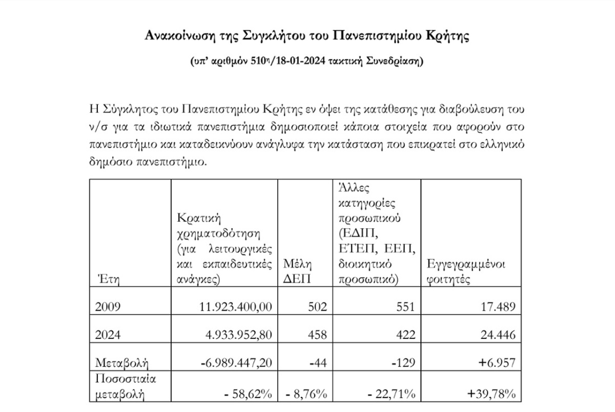 H Σύγκλητος του Πανεπιστημίου Κρήτης, σε ανακοίνωση που εξέδωσε ενόψει της διαβούλευσης του νομοσχεδίου για τα ιδιωτικά πανεπιστήμια, υπογραμμίζει ότι οι περικοπές στην κρατική χρηματοδότηση και η μείωση ανθρώπινου δυναμικού αποβαίνουν σε βάρος των παρεχόμενων υπηρεσιών.