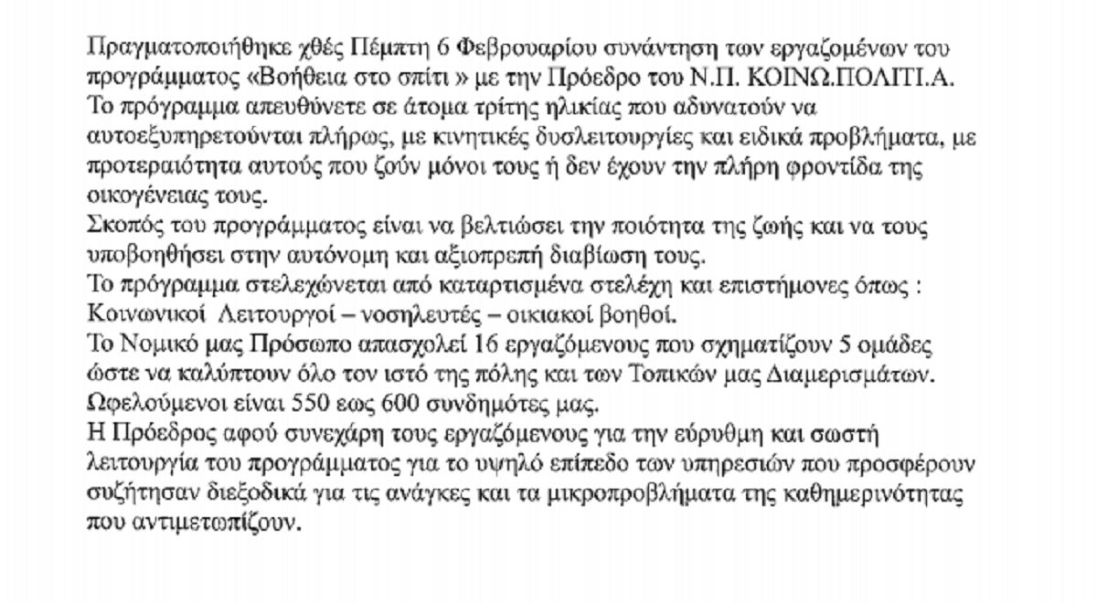 Συνάντηση εργαζομένων του «Βοήθεια στο σπίτι» με την πρόεδρο του Ν.Π. ΚΟΙΝΩ.ΠΟΛΙΤΙ.Α.