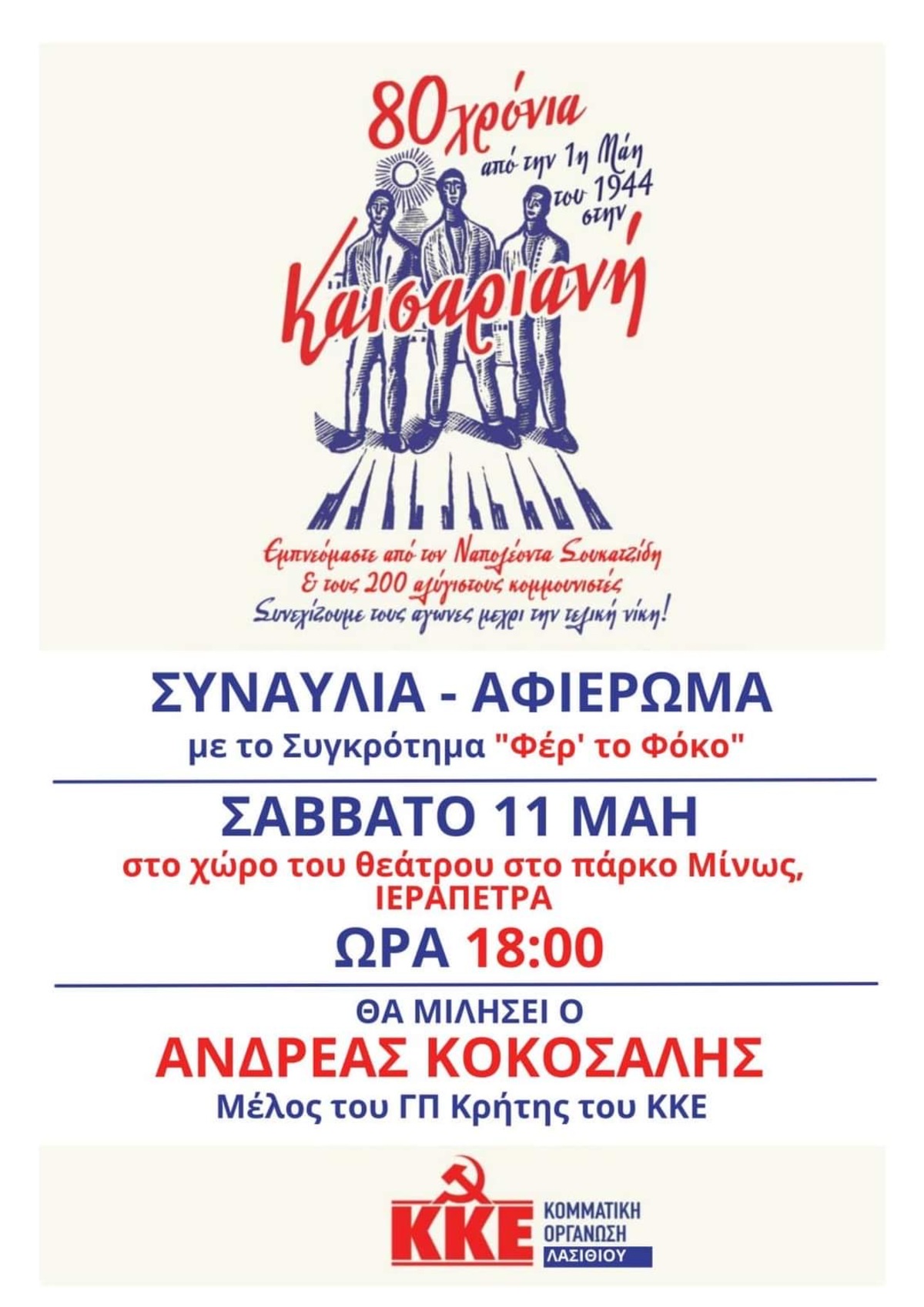 Η εκδήλωση θα γίνει το Σάββατο 11.05 στις 18:00 στο χώρο του θεάτρου στο πάρκο Μίνως στην Ιεράπετρα, και θα μιλήσει ο Ανδρέας Κοκοσάλης, μέλος του ΓΠ Κρήτης του ΚΚΕ