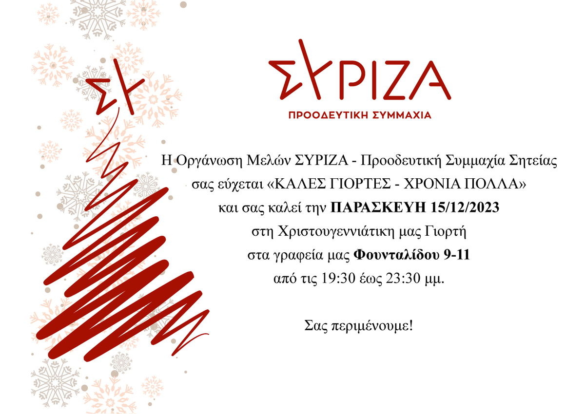 ΣΥΡΙΖΑ Σητείας: Διοργανώνει χριστουγεννιάτικη γιορτή ΕΝΟΤΗΤΕΣ ΠΟΛΙΤΙΚΗ 10:18 π.μ. - Δευτέρα 11 Δεκεμβρίου 2023 10:12 π.μ. - Δευ, 11/18/2023 ΧΡΙΣΤΟΥΓΕΝΝΙΑΤΙΚΗ ΓΙΟΡΤΗ, ΣΥΡΙΖΑ ΣΗΤΕΙΑΣ Την Παρασκευή 15 Δεκεμβρίου Την Χριστουγεννιάτικη εκδήλωσή του διοργανώνει ο ΣΥΡΙΖΑ Σητείας. Η εκδήλωση θα πραγματοποιηθεί την ερχόμενη Παρασκευή, 15 Δεκεμβρίου 2023 στα γραφεία της Οργάνωσης Μελών Σητείας του κόμματος.Σύμφωνα με τον προγραμματισμό θα ξεκινήσει στις 19:30.