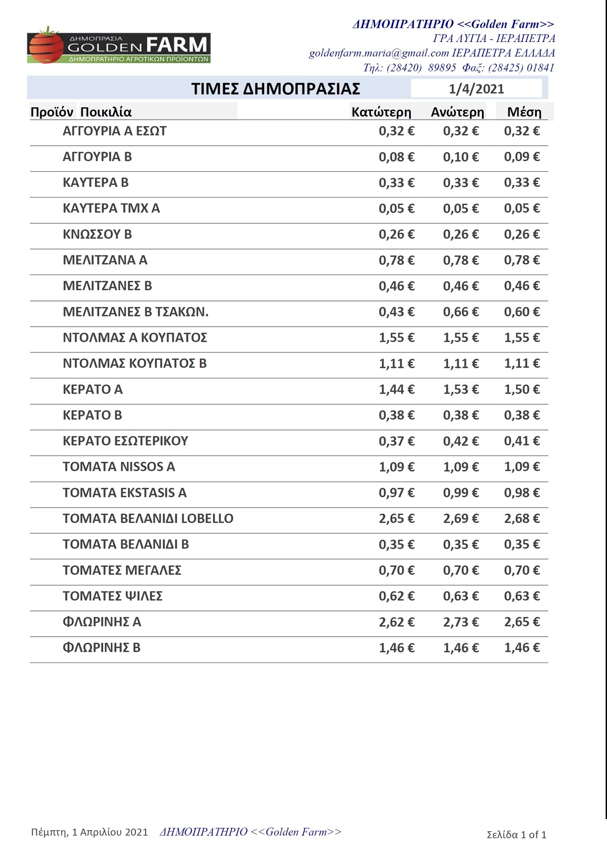 ΤΙΜΕΣ 01:24 μ.μ. - 25/03/2026 GOLDEN FARM |Τιμές Αγροτικών Προϊόντων 25.03.2026 ΙΕΡΑΠΕΤΡΑ, ΤΙΜΕΣ ΑΓΡΟΤΙΚΩΝ ΠΡΟΙΟΝΤΩΝ , ΔΗΜΟΠΡΑΤΗΡΙΟ, ΚΗΠΕΥΤΙΚΑ , GOLDEN FARM Δείτε τις σημερινές τιμές του δημοπρατηρίου