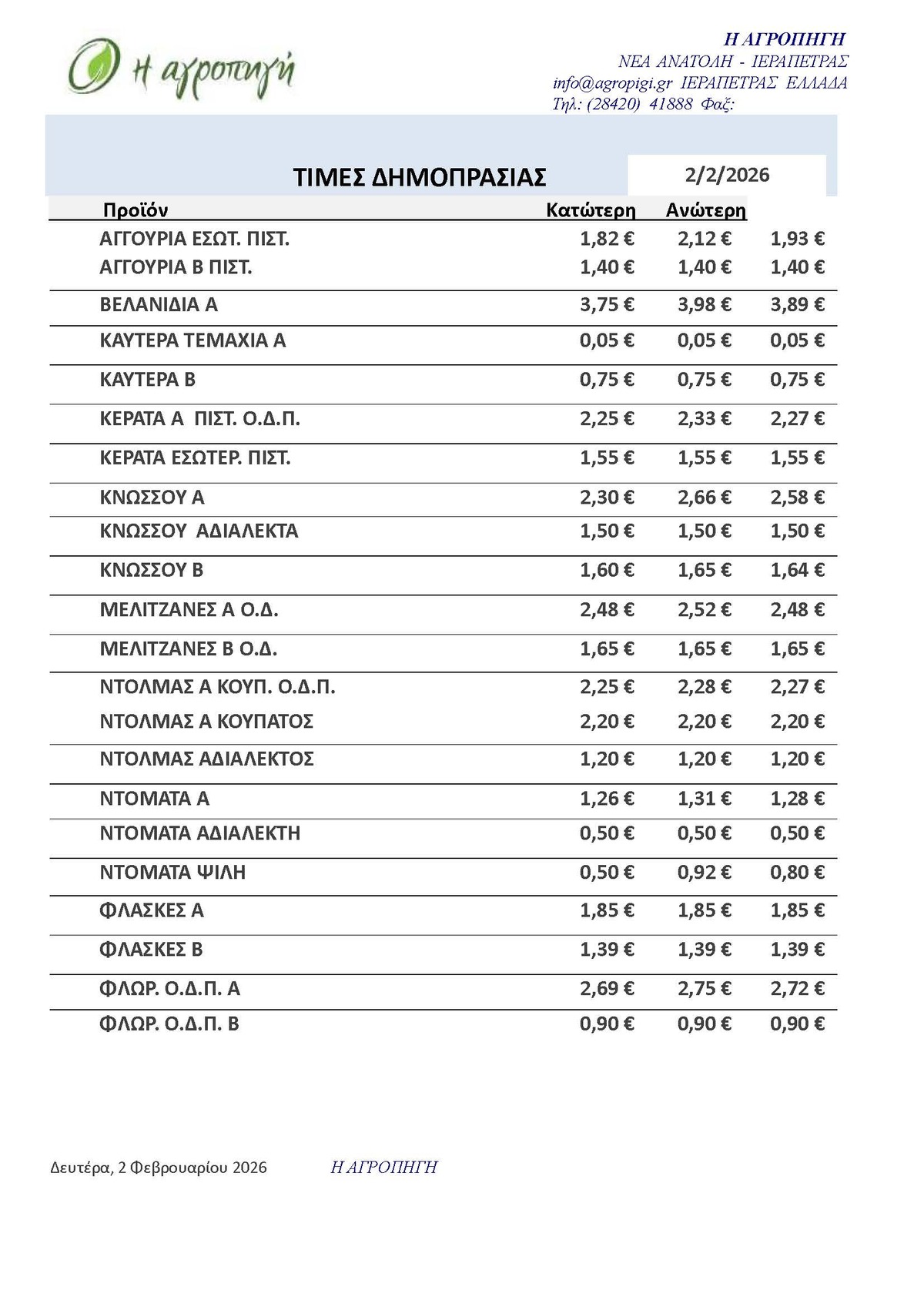 Τιμές Αγροτικών Προϊόντων 02.02.2026 ΤΙΜΕΣ 8:05 π.μ. - Δευτέρα 2 Φεβρουαρίου 2026 08:02 π.μ. - Δευ, 02/05/2026 ΙΕΡΑΠΕΤΡΑ, ΤΙΜΕΣ ΑΓΡΟΤΙΚΩΝ ΠΡΟΙΟΝΤΩΝ , ΔΗΜΟΠΡΑΤΗΡΙΟ, ΚΗΠΕΥΤΙΚΑ Δείτε τις σημερινές τιμές του δημοπρατηρίου