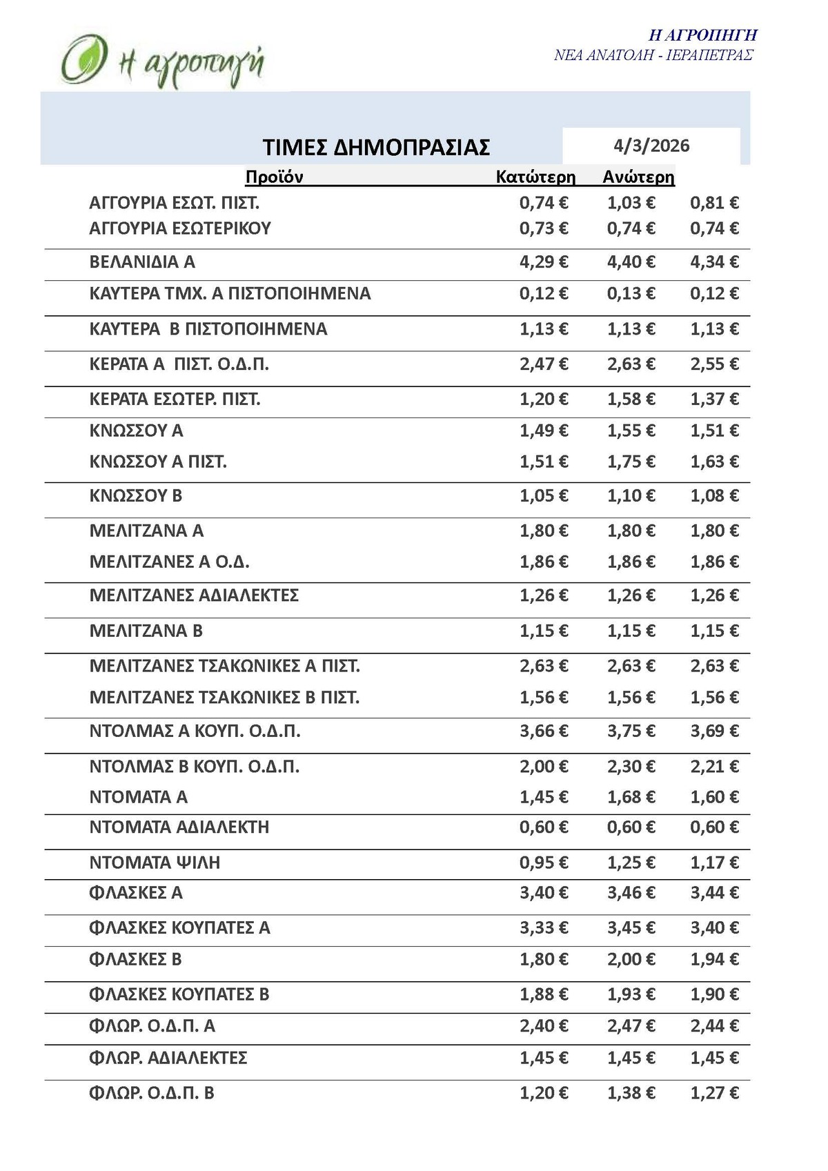 Τιμές Αγροτικών Προϊόντων 04.03.2026 ΤΙΜΕΣ 8:33 π.μ. - Τετάρτη 4 Μαρτίου 2026 08:03 π.μ. - Τετ, 04/33/2026 ΙΕΡΑΠΕΤΡΑ, ΤΙΜΕΣ ΑΓΡΟΤΙΚΩΝ ΠΡΟΙΟΝΤΩΝ, ΔΗΜΟΠΡΑΤΗΡΙΟ, ΚΗΠΕΥΤΙΚΑ Δείτε τις σημερινές τιμές του δημοπρατηρίου