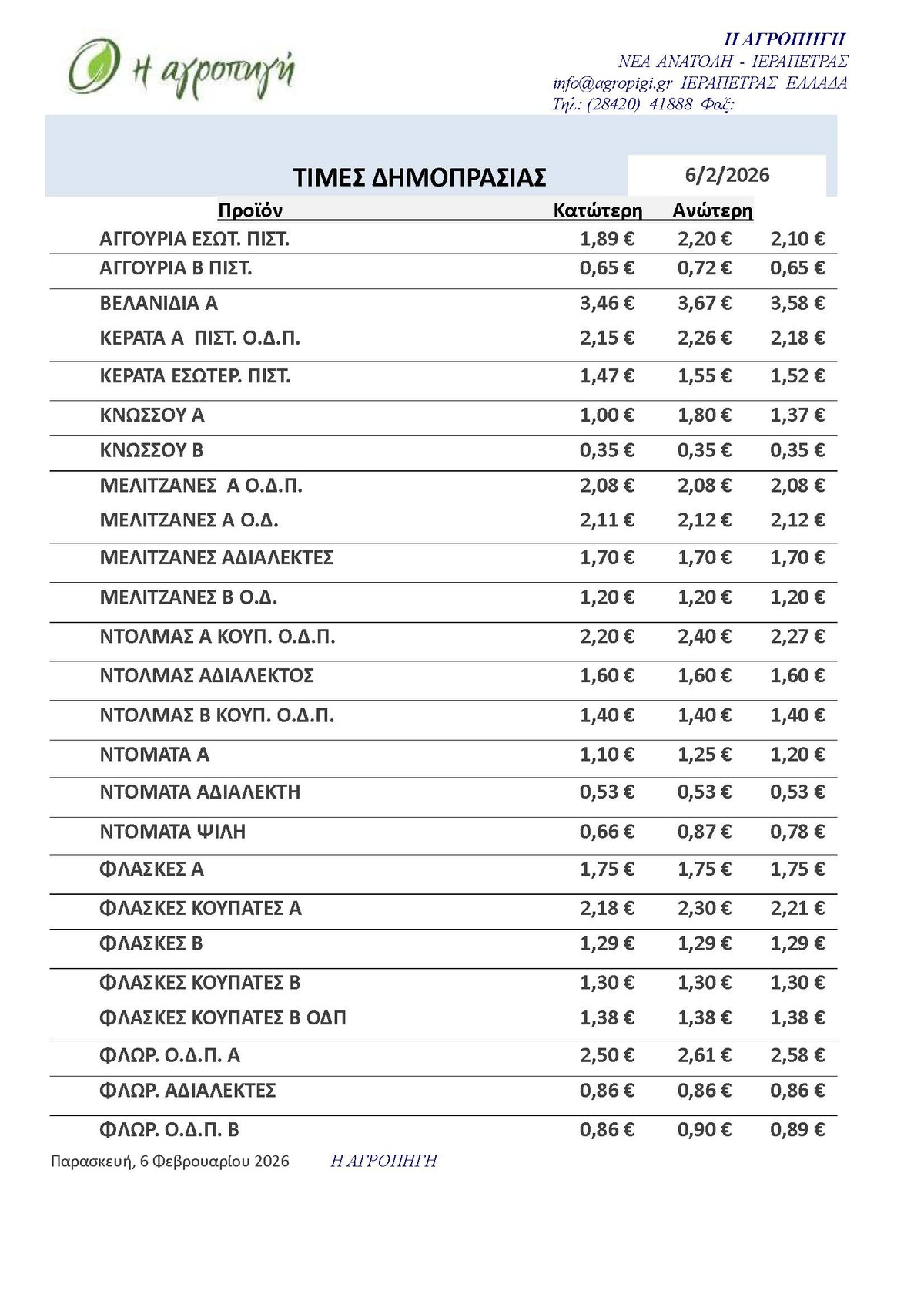 Τιμές Αγροτικών Προϊόντων 06.02.2026 ΤΙΜΕΣ 8:49 π.μ. - Παρασκευή 6 Φεβρουαρίου 2026 08:02 π.μ. - Παρ, 06/49/2026 ΙΕΡΑΠΕΤΡΑ, ΤΙΜΕΣ ΑΓΡΟΤΙΚΩΝ ΠΡΟΙΟΝΤΩΝ, ΔΗΜΟΠΡΑΤΗΡΙΟ, ΚΗΠΕΥΤΙΚΑ Δείτε τις σημερινές τιμές του δημοπρατηρίου