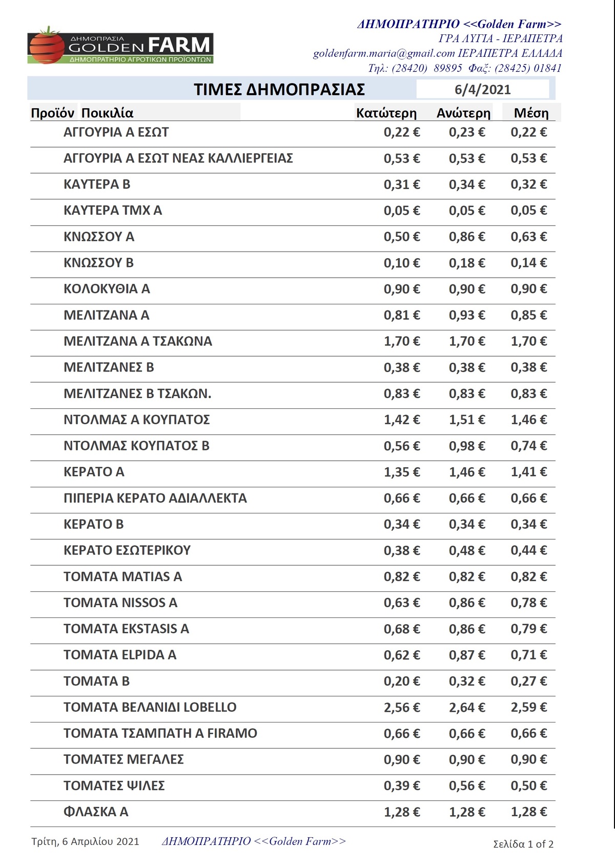 ΤΙΜΕΣ 02:29 μ.μ. - 17/03/2026 GOLDEN FARM |Τιμές Αγροτικών Προϊόντων 17.03.2026 ΙΕΡΑΠΕΤΡΑ, ΤΙΜΕΣ ΑΓΡΟΤΙΚΩΝ ΠΡΟΙΟΝΤΩΝ, ΔΗΜΟΠΡΑΤΗΡΙΟ, ΚΗΠΕΥΤΙΚΑ , GOLDEN FARM Δείτε τις σημερινές τιμές του δημοπρατηρίου