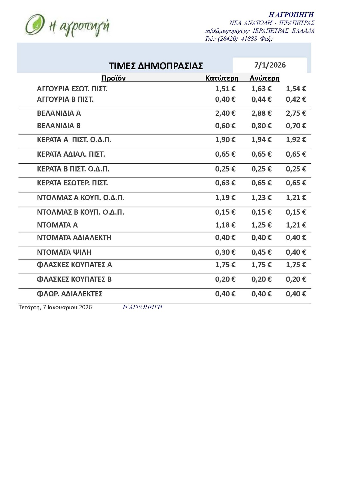 Τιμές Αγροτικών Προϊόντων 07.01.2026 ΤΙΜΕΣ 10:40 π.μ. - Τετάρτη 7 Ιανουαρίου 2026 10:01 π.μ. - Τετ, 07/40/2026 ΙΕΡΑΠΕΤΡΑ, ΤΙΜΕΣ ΑΓΡΟΤΙΚΩΝ ΠΡΟΙΟΝΤΩΝ, ΔΗΜΟΠΡΑΤΗΡΙΟ, ΚΗΠΕΥΤΙΚΑ Δείτε τις σημερινές τιμές του δημοπρατηρίου