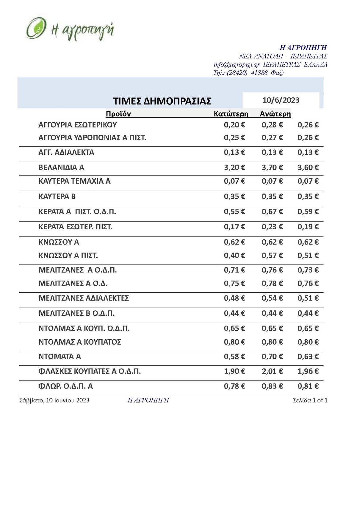 Τιμές Αγροτικών Προϊόντων 10.06.2023 ΤΙΜΕΣ 12:12 μ.μ. - Σάββατο 10 Ιουνίου 2023 12:06 μ.μ. - Σάβ, 10/12/2023 ΙΕΡΑΠΕΤΡΑ, ΤΙΜΕΣ ΑΓΡΟΤΙΚΩΝ ΠΡΟΙΟΝΤΩΝ , ΔΗΜΟΠΡΑΤΗΡΙΟ, ΚΗΠΕΥΤΙΚΑ ΠΡΟΙΟΝΤΑ Η πρώτη δημοπρασία της ημέρας