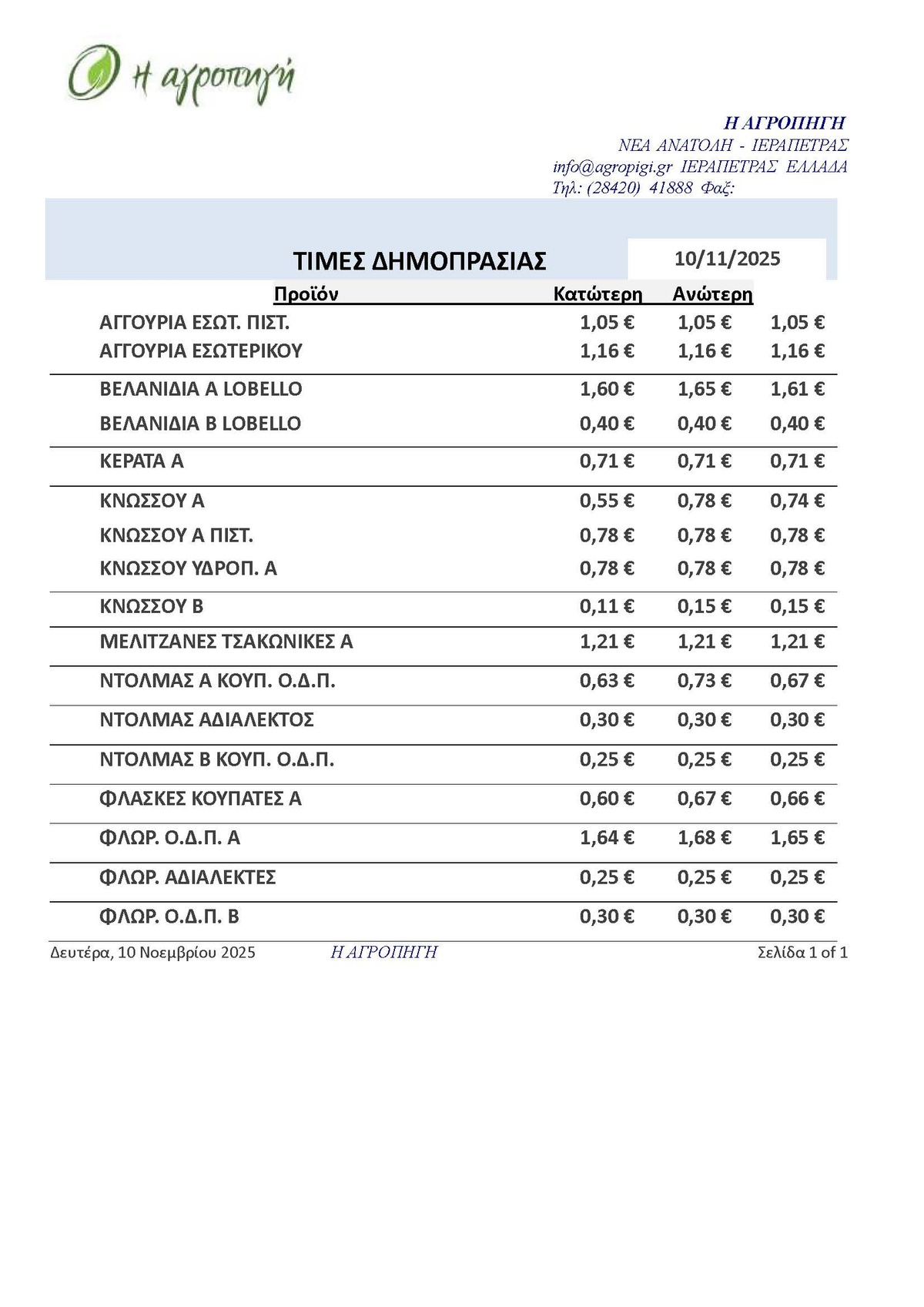 Τιμές Αγροτικών Προϊόντων 10.11.2025 ΤΙΜΕΣ 9:44 π.μ. - Δευτέρα, 10 Νοεμβρίου 2025 09:11 π.μ. - Δευ, 10/44/2025 ΙΕΡΑΠΕΤΡΑ, ΤΙΜΕΣ ΑΓΡΟΤΙΚΩΝ ΠΡΟΙΟΝΤΩΝ , ΔΗΜΟΠΡΑΣΙΑ, ΚΗΠΕΥΤΙΚΑ ΠΡΟΙΟΝΤΑ Δείτε τις σημερινές τιμές του δημοπρατηρίου