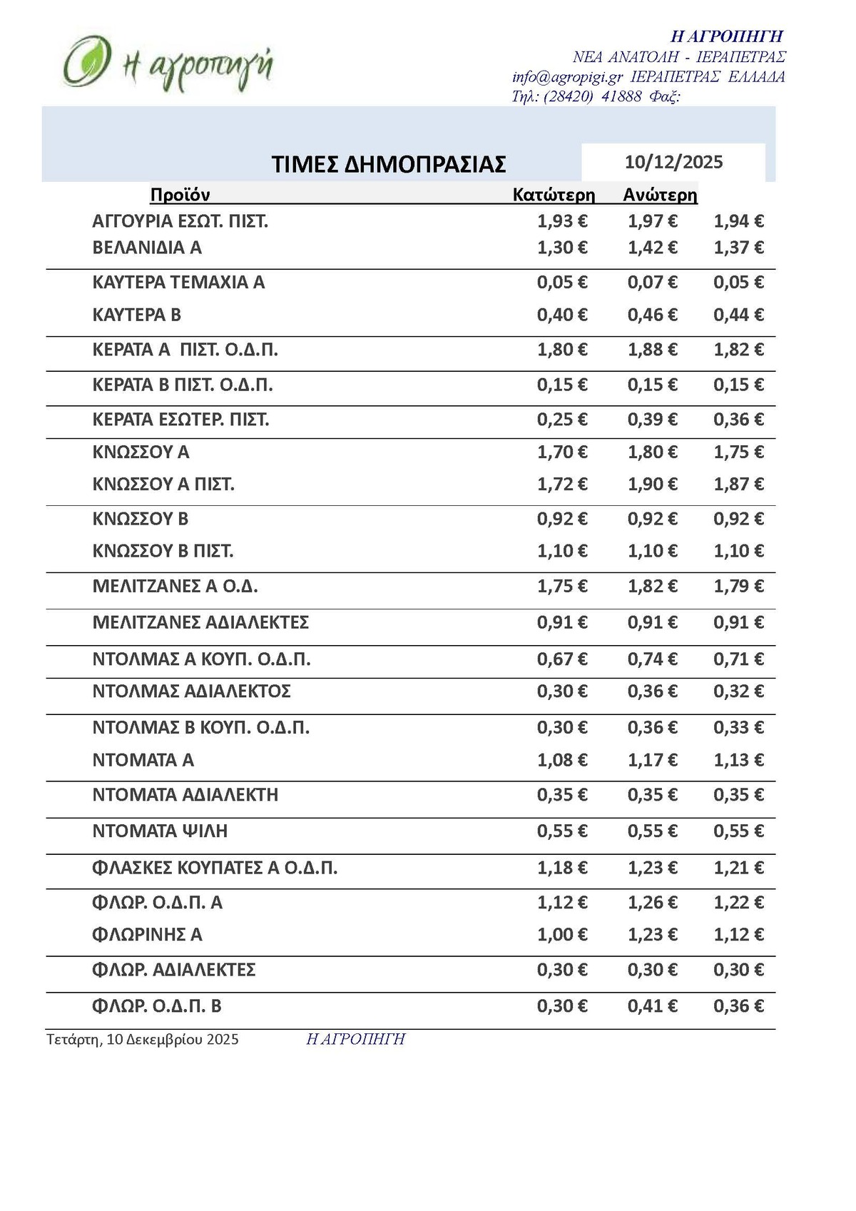 Τιμές Αγροτικών Προϊόντων 10.12.2025 ΤΙΜΕΣ 10:34 π.μ. - Τετάρτη, 10 Δεκεμβρίου 2025 10:12 π.μ. - Τετ, 10/34/2025 ΙΕΡΑΠΕΤΡΑ, ΤΙΜΕΣ ΑΓΡΟΤΙΚΩΝ ΠΡΟΙΟΝΤΩΝ , ΔΗΜΟΠΡΑΤΗΡΙΟ, ΚΗΠΕΥΤΙΚΑ ΠΡΟΙΟΝΤΑ Δείτε τις σημερινές τιμές του δημοπρατηρίου