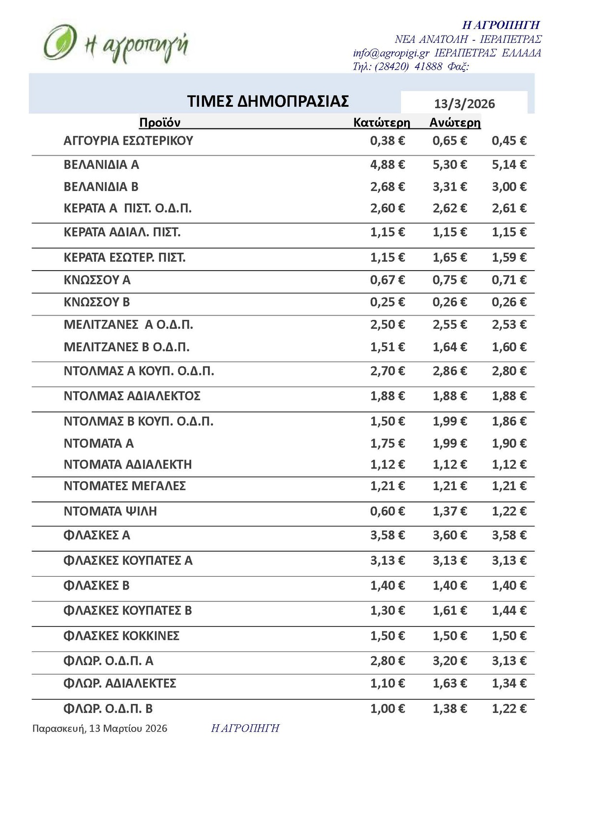 Τιμές Αγροτικών Προϊόντων 13.03.2026 ΤΙΜΕΣ 8:47 π.μ. - Παρασκευή 13 Μαρτίου 2026 08:03 π.μ. - Παρ, 13/47/2026 ΙΕΡΑΠΕΤΡΑ, ΤΙΜΕΣ ΑΓΡΟΤΙΚΩΝ ΠΡΟΙΟΝΤΩΝ , ΔΗΜΟΠΡΑΤΗΡΙΟ, ΚΗΠΕΥΤΙΚΑ Δείτε τις σημερινές τιμές του δημοπρατηρίου