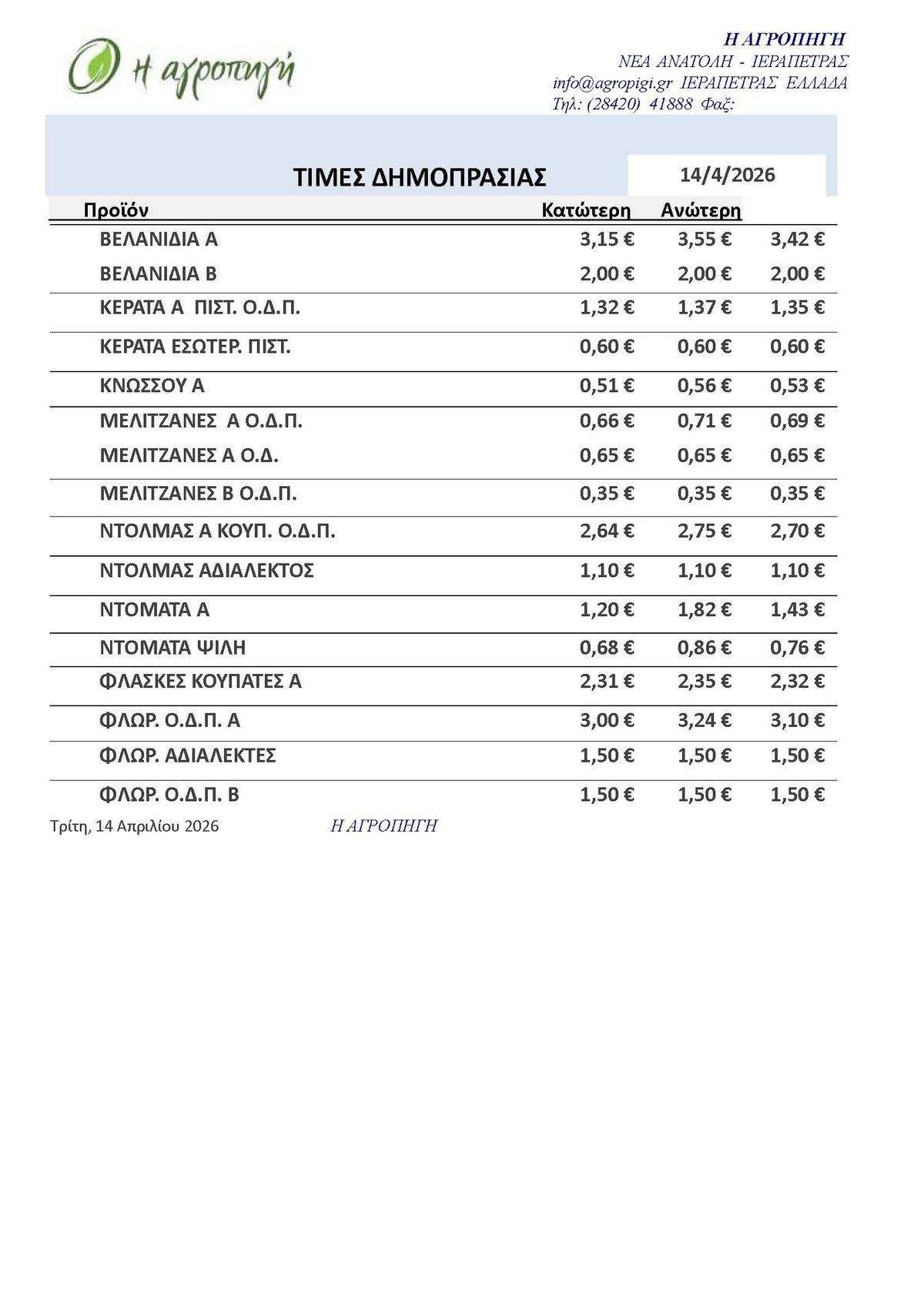 Τιμές Αγροτικών Προϊόντων 14.04.2026 ΤΙΜΕΣ 7:21 π.μ. - Τρίτη 14 Απριλίου 2026 07:04 π.μ. - Τρί, 14/21/2026 ΙΕΡΑΠΕΤΡΑ, ΤΙΜΕΣ ΑΓΡΟΤΙΚΩΝ ΠΡΟΙΟΝΤΩΝ , ΔΗΜΟΠΡΑΤΗΡΙΟ, ΚΗΠΕΥΤΙΚΑ Δείτε τις σημερινές τιμές του δημοπρατηρίου