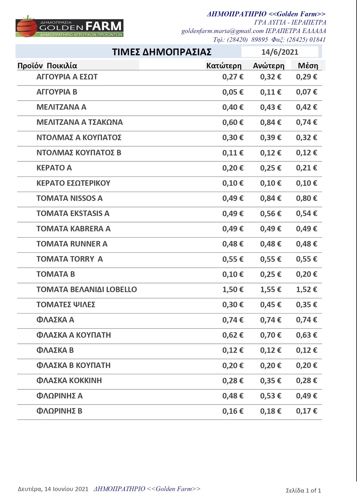 Τιμές Αγροτικών Προϊόντων 14.06.2021 ΤΙΜΕΣ 2:07 μ.μ. - Δευτέρα 14 Ιουνίου 2021 02:06 μ.μ. - Δευ, 14/07/2021 ΤΙΜΕΣ Δείτε τιμές δημοπρατηρίων της Ιεράπετρας