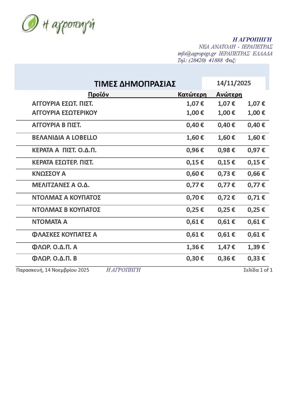 Τιμές Αγροτικών Προϊόντων 14.11.2025 ΤΙΜΕΣ 9:59 π.μ. - Παρασκευή, 14 Νοεμβρίου 2025 09:11 π.μ. - Παρ, 14/59/2025 ΙΕΡΑΠΕΤΡΑ, ΤΙΜΕΣ ΑΓΡΟΤΙΚΩΝ ΠΡΟΙΟΝΤΩΝ , ΔΗΜΟΠΡΑΤΗΡΙΟ, ΚΗΠΕΥΤΙΚΑ Δείτε τις σημερινές τιμές του δημοπρατηρίου