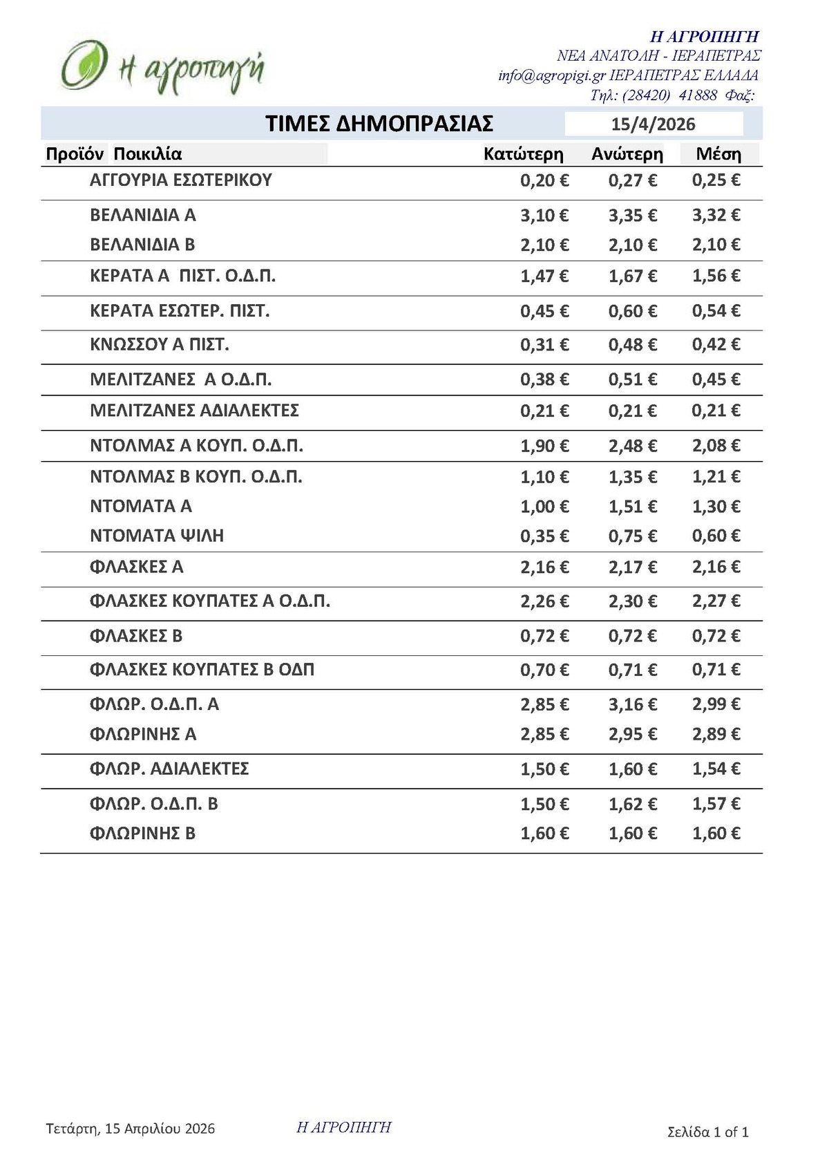 ΤΙΜΕΣ 08:28 π.μ. - 17/04/2026 Τιμές Αγροτικών Προϊόντων 17.04.2026 ΙΕΡΑΠΕΤΡΑ, ΤΙΜΕΣ ΑΓΡΟΤΙΚΩΝ ΠΡΟΙΟΝΤΩΝ , ΔΗΜΟΠΡΑΤΗΡΙΟ, ΚΗΠΕΥΤΙΚΑ Δείτε τις σημερινές τιμές του δημοπρατηρίου