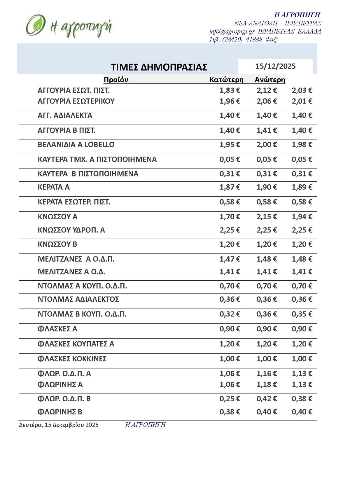 Τιμές Αγροτικών Προϊόντων 15.12.2025 ΤΙΜΕΣ 10:06 π.μ. - Δευτέρα, 15 Δεκεμβρίου 2025 10:12 π.μ. - Δευ, 15/06/2025 ΙΕΡΑΠΕΤΡΑ, ΤΙΜΕΣ ΑΓΡΟΤΙΚΩΝ ΠΡΟΙΟΝΤΩΝ, ΔΗΜΟΠΡΑΤΗΡΙΟ, ΚΗΠΕΥΤΙΚΑ Δείτε τις σημερινές τιμές του δημοπρατηρίου