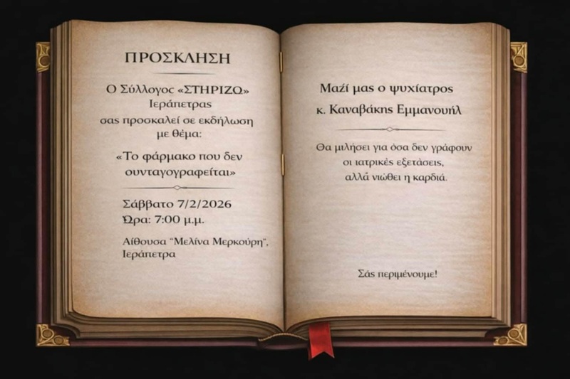 ΙΕΡΑΠΕΤΡΑ ΕΚΔΗΛΩΣΗ, ΣΤΗΡΙΖΩ, ΨΥΧΙΑΤΡΟΣ, ΚΑΝΑΒΑΚΗΣ Ο Σύλλογος ΣΤΗΡΙΖΩ διοργανώνει εκδήλωση για την ψυχική υγεία με τον ψυχίατρο Εμμανουήλ Καναβάκη 05:43 π.μ. - 03/02/2026