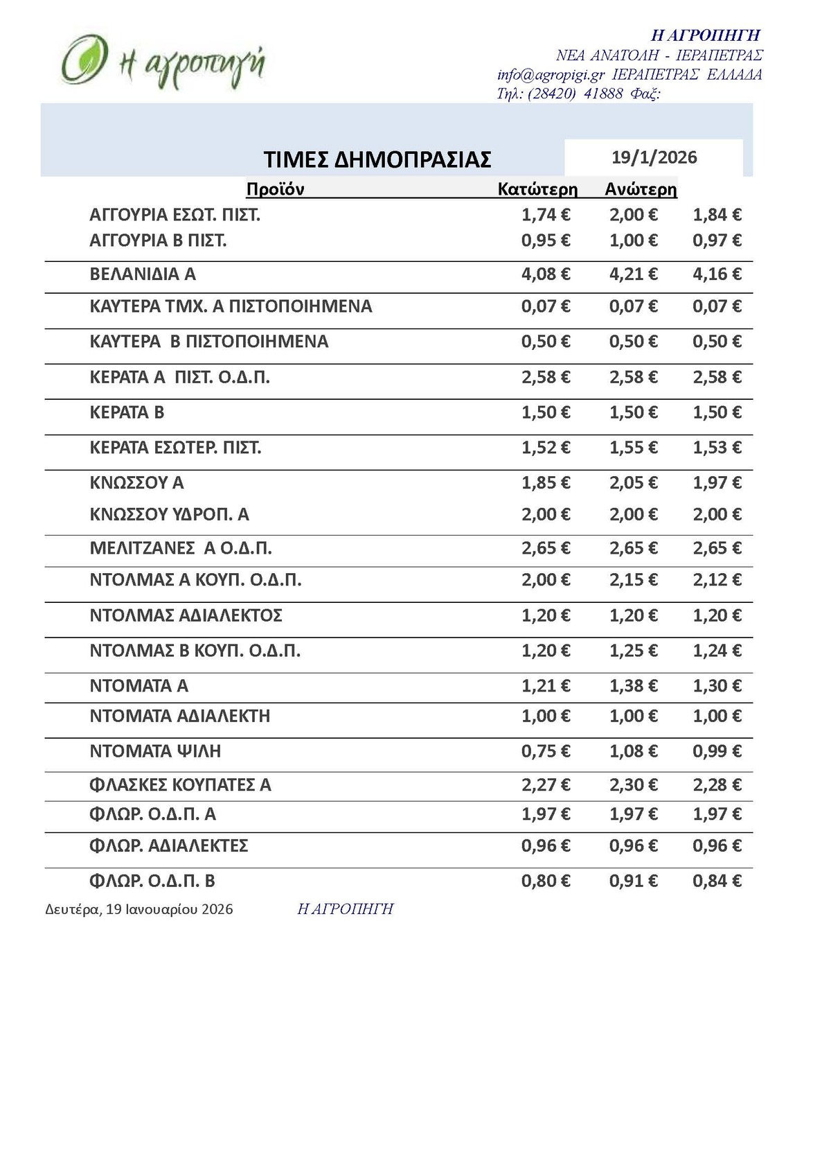 Τιμές Αγροτικών Προϊόντων 19.01.2026 ΤΙΜΕΣ 10:29 π.μ. - Δευτέρα, 19 Ιανουαρίου 2026 10:01 π.μ. - Δευ, 19/29/2026 ΙΕΡΑΠΕΤΡΑ, ΤΙΜΕΣ ΑΓΡΟΤΙΚΩΝ ΠΡΟΙΟΝΤΩΝ , ΔΗΜΟΠΡΑΤΗΡΙΟ, ΚΗΠΕΥΤΙΚΑ Δείτε τις σημερινές τιμές του δημοπρατηρίου