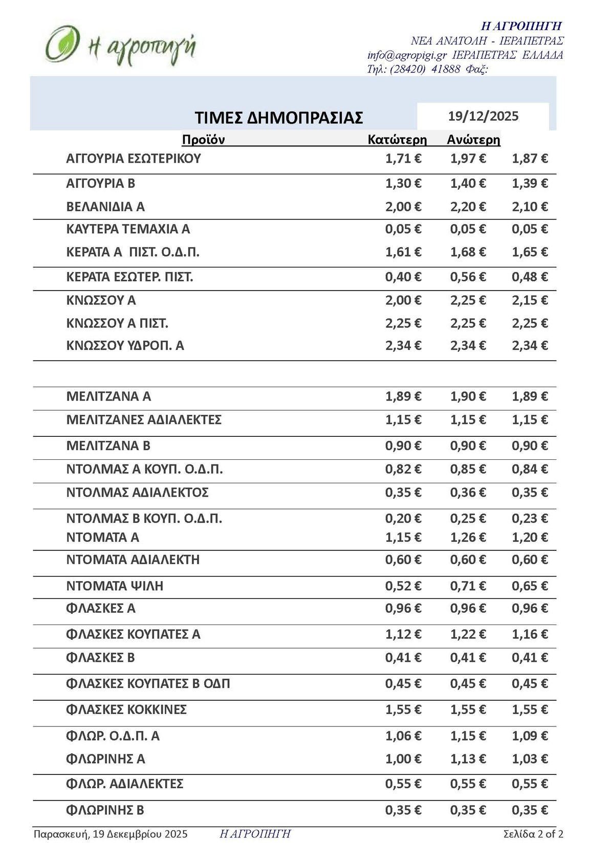 Τιμές Αγροτικών Προϊόντων 19.12.2025 ΤΙΜΕΣ 10:32 π.μ. - Παρασκευή, 19 Δεκεμβρίου 2025 10:12 π.μ. - Παρ, 19/32/2025 ΙΕΡΑΠΕΤΡΑ, ΤΙΜΕΣ ΑΓΡΟΤΙΚΩΝ ΠΡΟΙΟΝΤΩΝ , ΔΗΜΟΠΡΑΤΗΡΙΟ, ΚΗΠΕΥΤΙΚΑ Δείτε τις σημερινές τιμές του δημοπρατηρίου