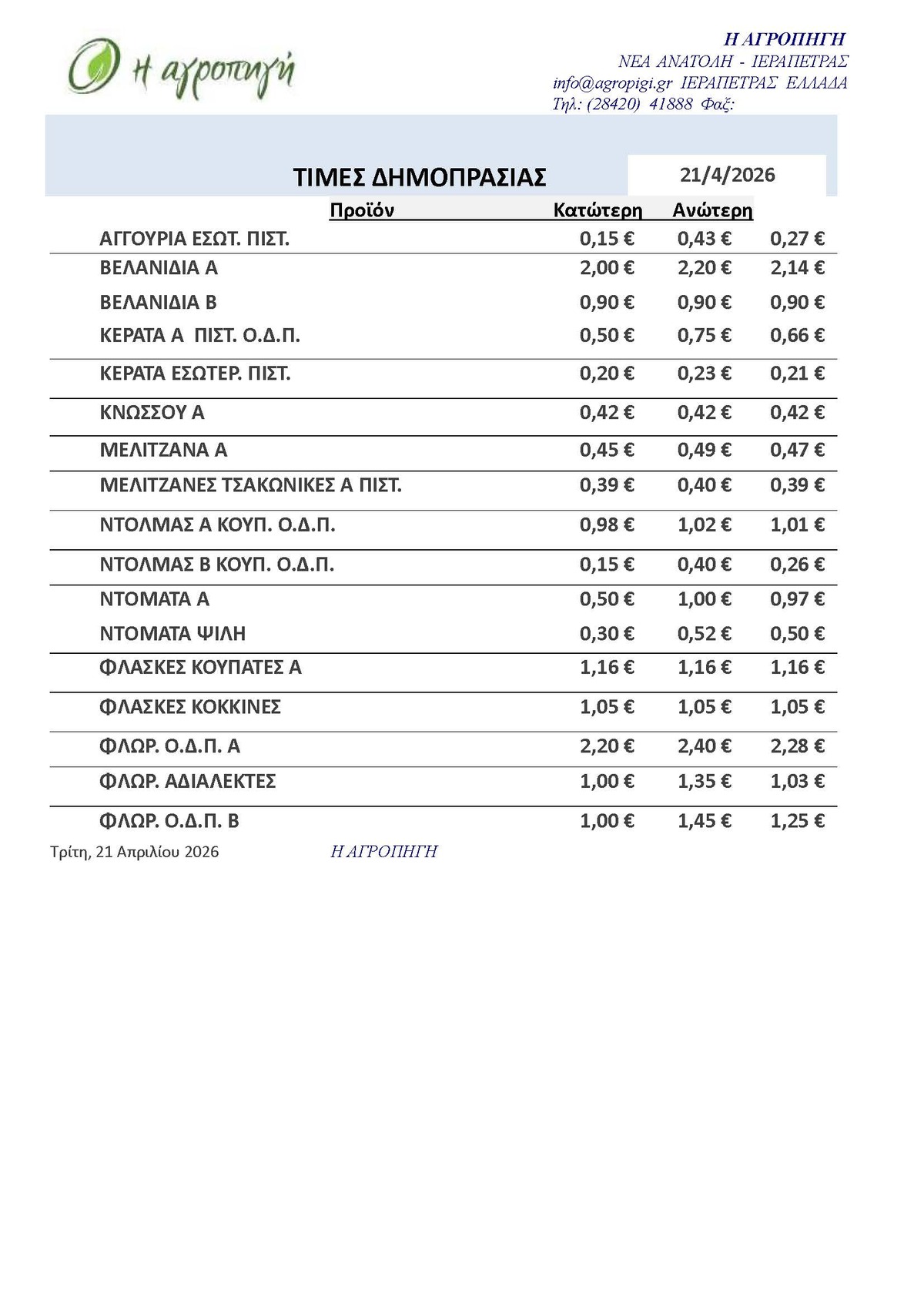 Τιμές Αγροτικών Προϊόντων 21.04.2026 ΤΙΜΕΣ 7:59 π.μ. - Τρίτη 21 Απριλίου 2026 07:04 π.μ. - Τρί, 21/59/2026 ΙΕΡΑΠΕΤΡΑ, ΤΙΜΕΣ ΑΓΡΟΤΙΚΩΝ ΠΡΟΙΟΝΤΩΝ, ΔΗΜΟΠΡΑΤΗΡΙΟ, ΚΗΠΕΥΤΙΚΑ Δείτε τις σημερινές τιμές του δημοπρατηρίου