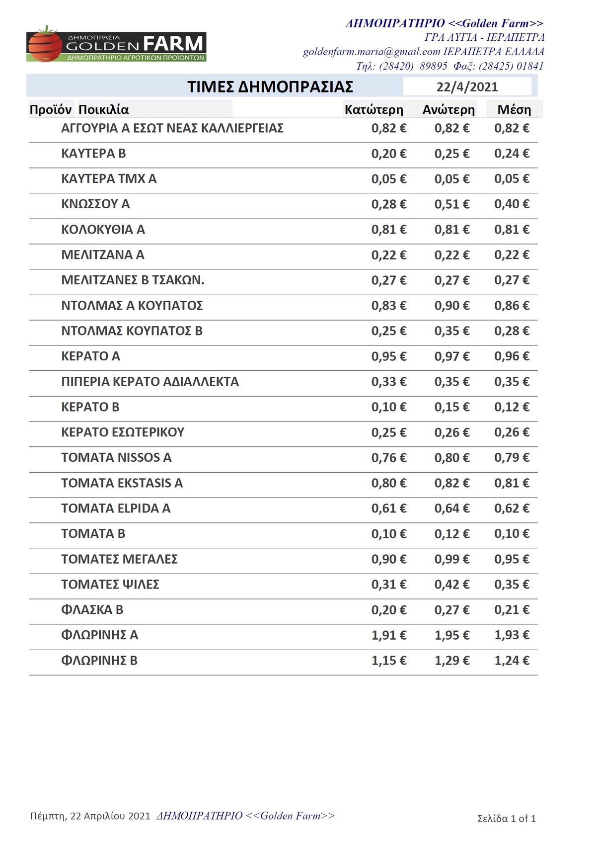 Τιμές Αγροτικών Προϊόντων 22.04.21 ΤΙΜΕΣ 12:18 μ.μ. - Πέμπτη 22 Απριλίου 2021 12:04 μ.μ. - Πέμ, 22/18/2021 ΤΙΜΕΣ Δείτε εδώ τις τιμές των δημοπρατηρίων
