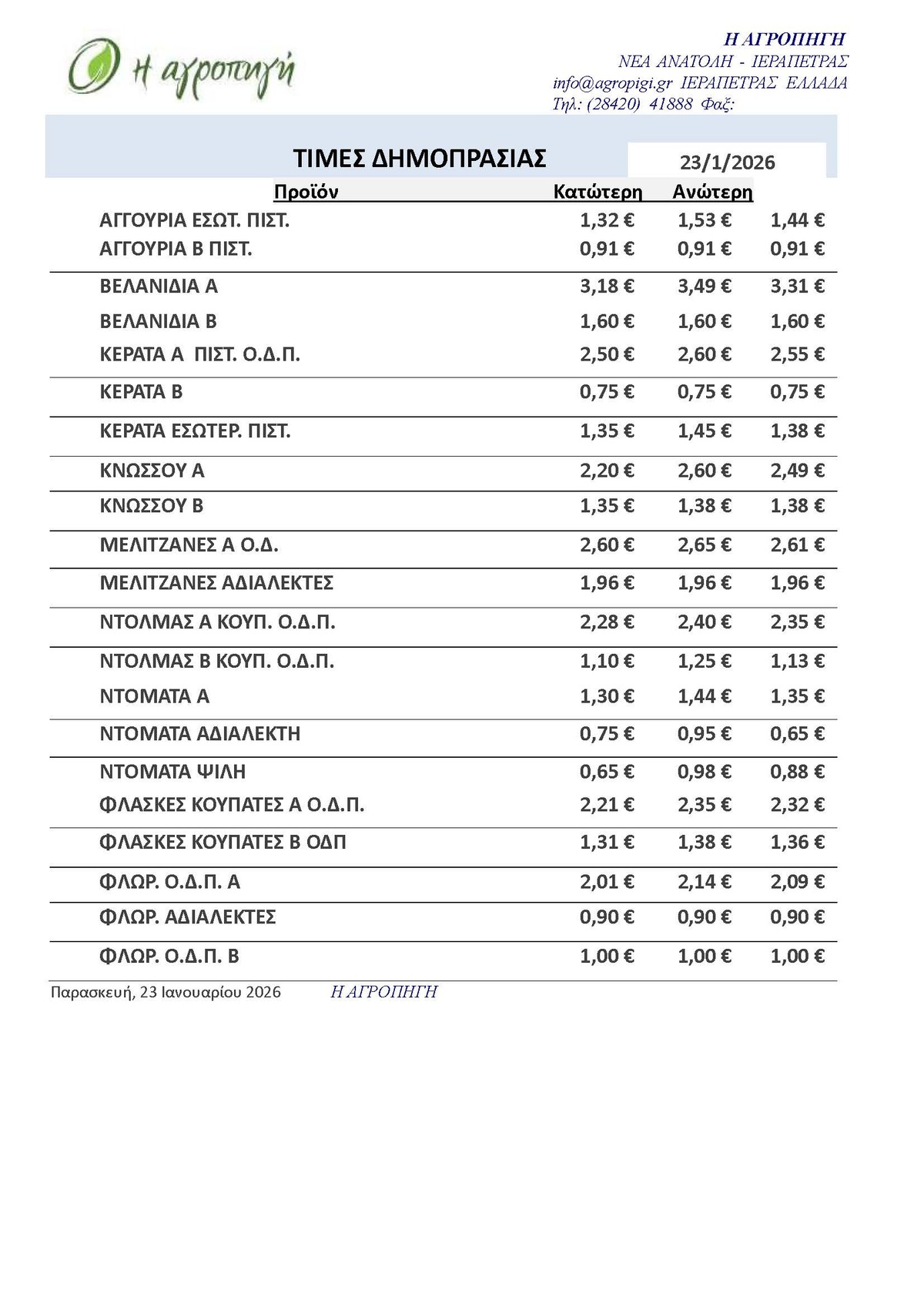 Τιμές Αγροτικών Προϊόντων 23.01.2026 ΤΙΜΕΣ 8:32 π.μ. - Παρασκευή 23 Ιανουαρίου 2026 08:01 π.μ. - Παρ, 23/32/2026 ΙΕΡΑΠΕΤΡΑ, ΤΙΜΕΣ ΑΓΡΟΤΙΚΩΝ ΠΡΟΙΟΝΤΩΝ, ΔΗΜΟΠΡΑΤΗΡΙΟ, ΚΗΠΕΥΤΙΚΑ Δείτε τις σημερινές τιμές του δημοπρατηρίου