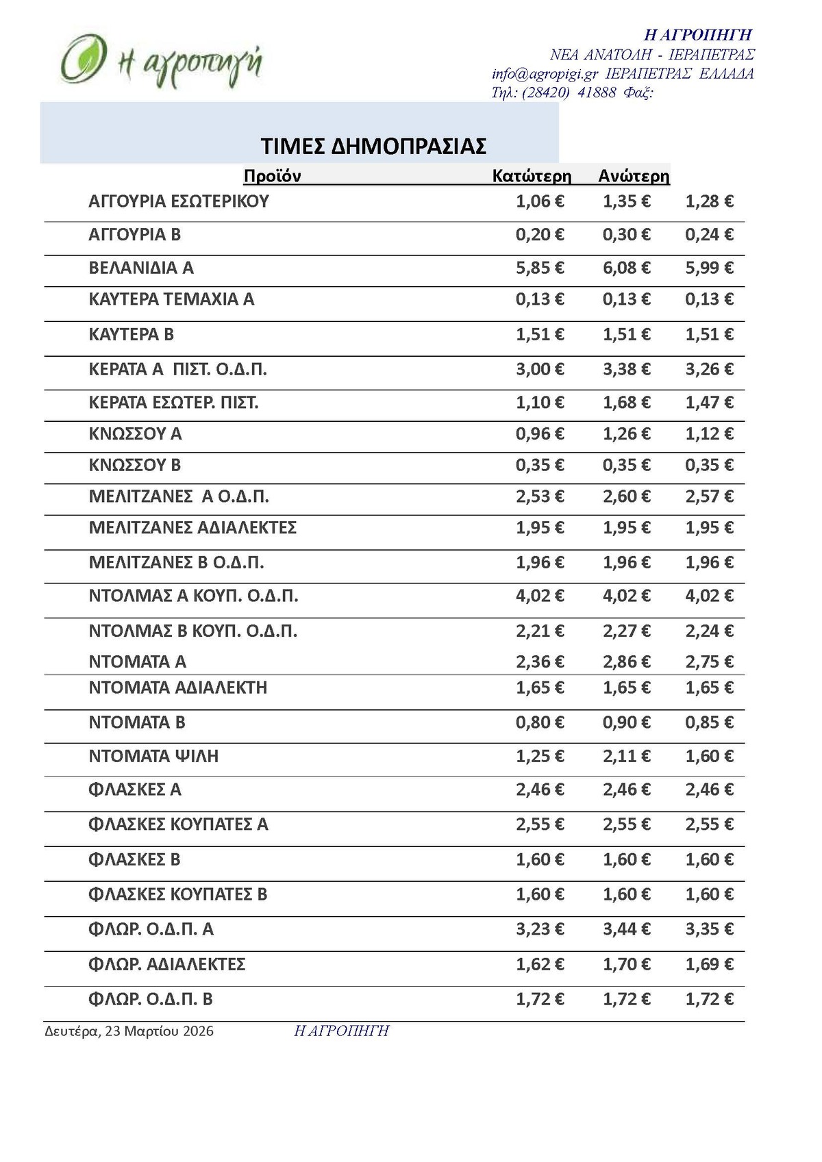 Τιμές Αγροτικών Προϊόντων 23.03.2026 ΤΙΜΕΣ 9:46 π.μ. - Δευτέρα 23 Μαρτίου 2026 09:03 π.μ. - Δευ, 23/46/2026 ΙΕΡΑΠΕΤΡΑ, ΤΙΜΕΣ ΑΓΡΟΤΙΚΩΝ ΠΡΟΙΟΝΤΩΝ , ΔΗΜΟΠΡΑΤΗΡΙΟ, ΚΗΠΕΥΤΙΚΑ Δείτε τις σημερινές τιμές του δημοπρατηρίου