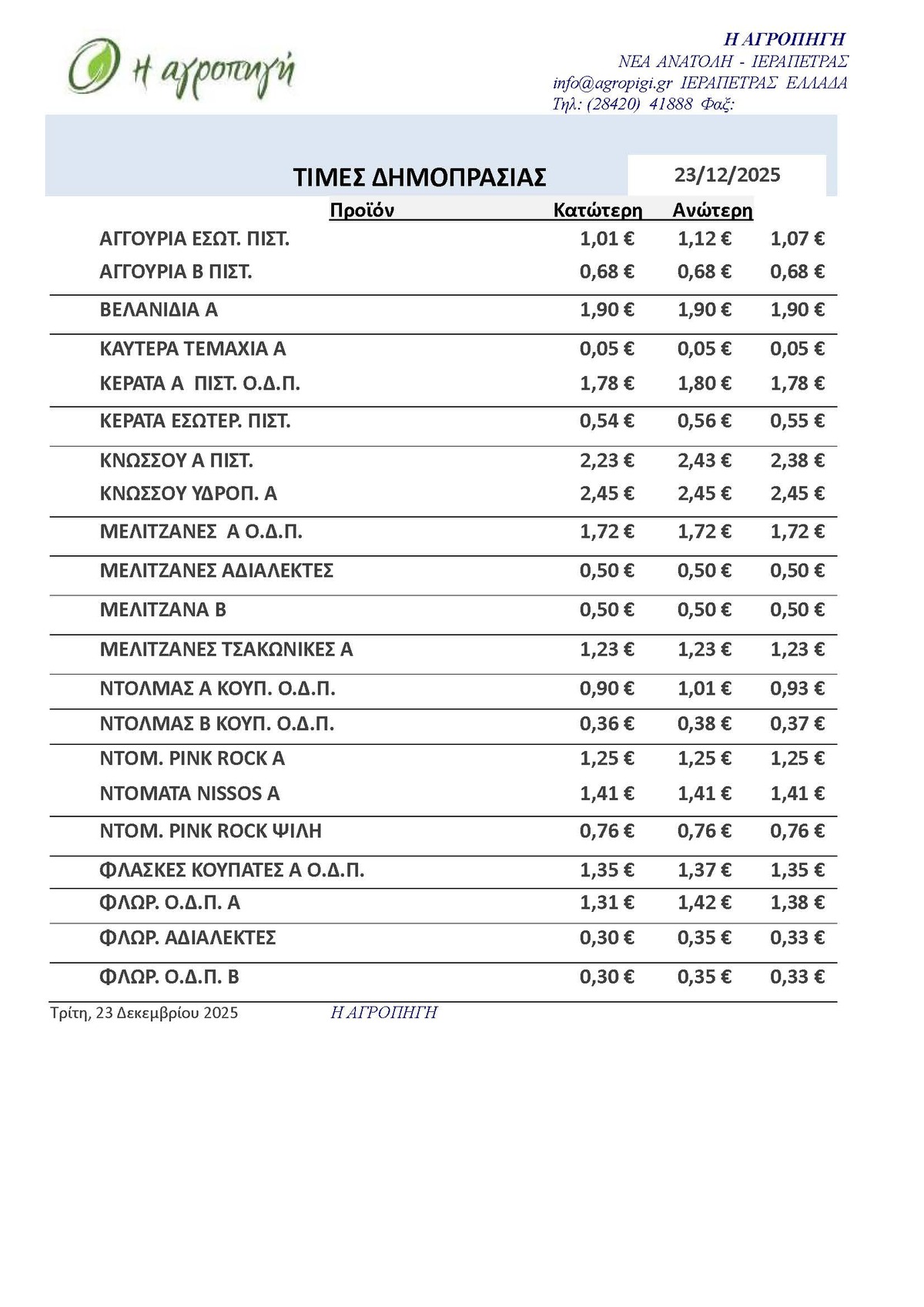 Τιμές Αγροτικών Προϊόντων 23.12.2025 ΤΙΜΕΣ 10:15 π.μ. - Τρίτη 23 Δεκεμβρίου 2025 10:12 π.μ. - Τρί, 23/15/2025 ΙΕΡΑΠΕΤΡΑ, ΤΙΜΕΣ ΑΓΡΟΤΙΚΩΝ ΠΡΟΙΟΝΤΩΝ, ΔΗΜΟΠΡΑΤΗΡΙΟ, ΚΗΠΕΥΤΙΚΑ Δείτε τις σημερινές τιμές του δημοπρατηρίου