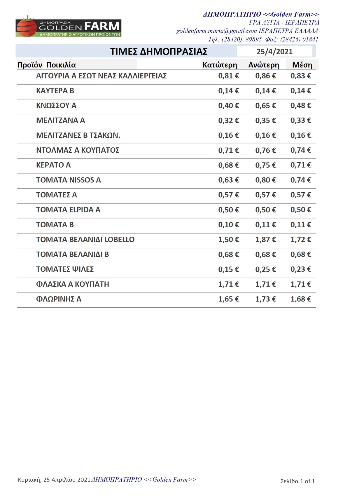 Τιμές Αγροτικών Προϊόντων 25-4-21 ΟΙΚΟΝΟΜΙΑ 1:03 μ.μ. - Κυριακή 25 Απριλίου 2021 01:04 μ.μ. - Κυρ, 25/03/2021 ΤΙΜΕΣ ΑΓΡΟΤΙΚΩΝ ΠΡΟΙΟΝΤΩΝ, ΔΗΜΟΠΡΑΤΗΡΙΑ Δείτε εδώ τις τιμές των δημοπρατηρίων