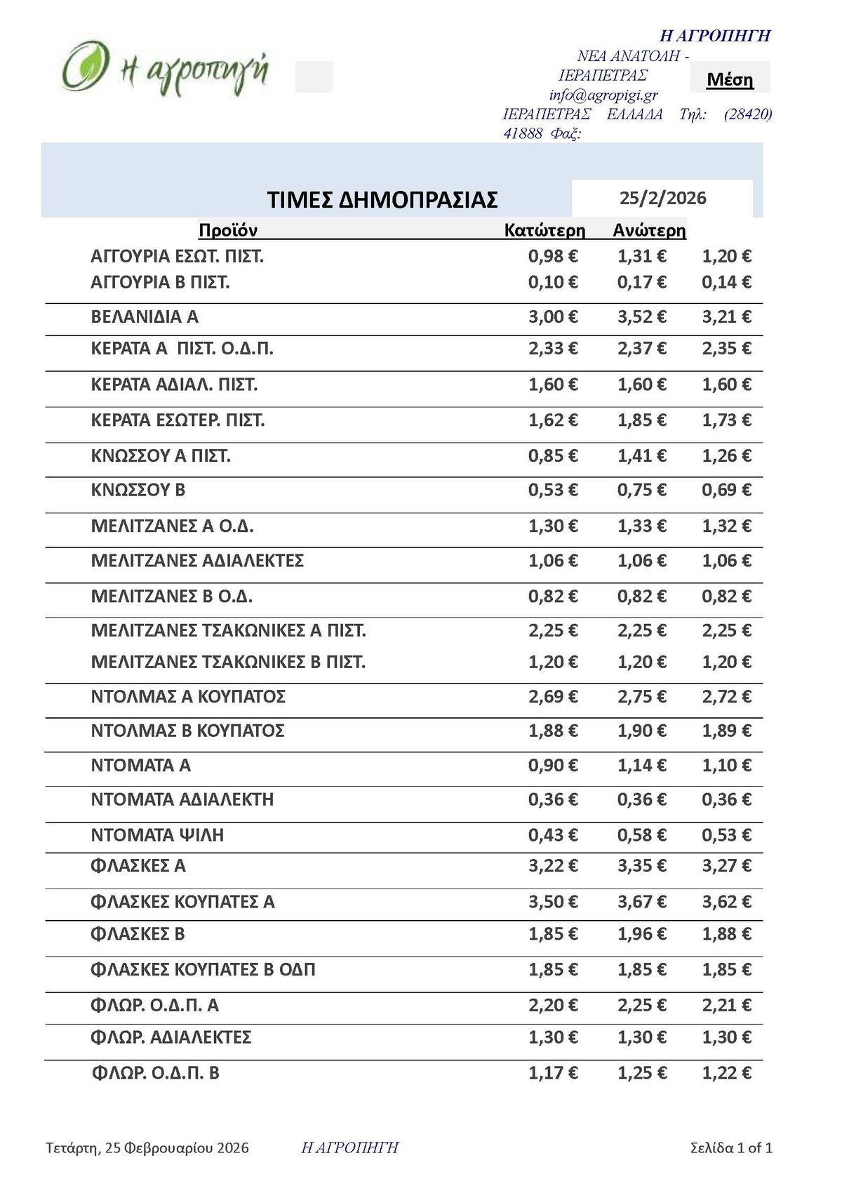 Τιμές Αγροτικών Προϊόντων 25.02.2026 ΤΙΜΕΣ 8:09 π.μ. - Τετάρτη 25 Φεβρουαρίου 2026 08:02 π.μ. - Τετ, 25/09/2026 ΙΕΡΑΠΕΤΡΑ, ΤΙΜΕΣ ΑΓΡΟΤΙΚΩΝ ΠΡΟΙΟΝΤΩΝ , ΔΗΜΟΠΡΑΤΗΡΙΟ, ΚΗΠΕΥΤΙΚΑ Δείτε τις σημερινές τιμές του δημοπρατηρίου