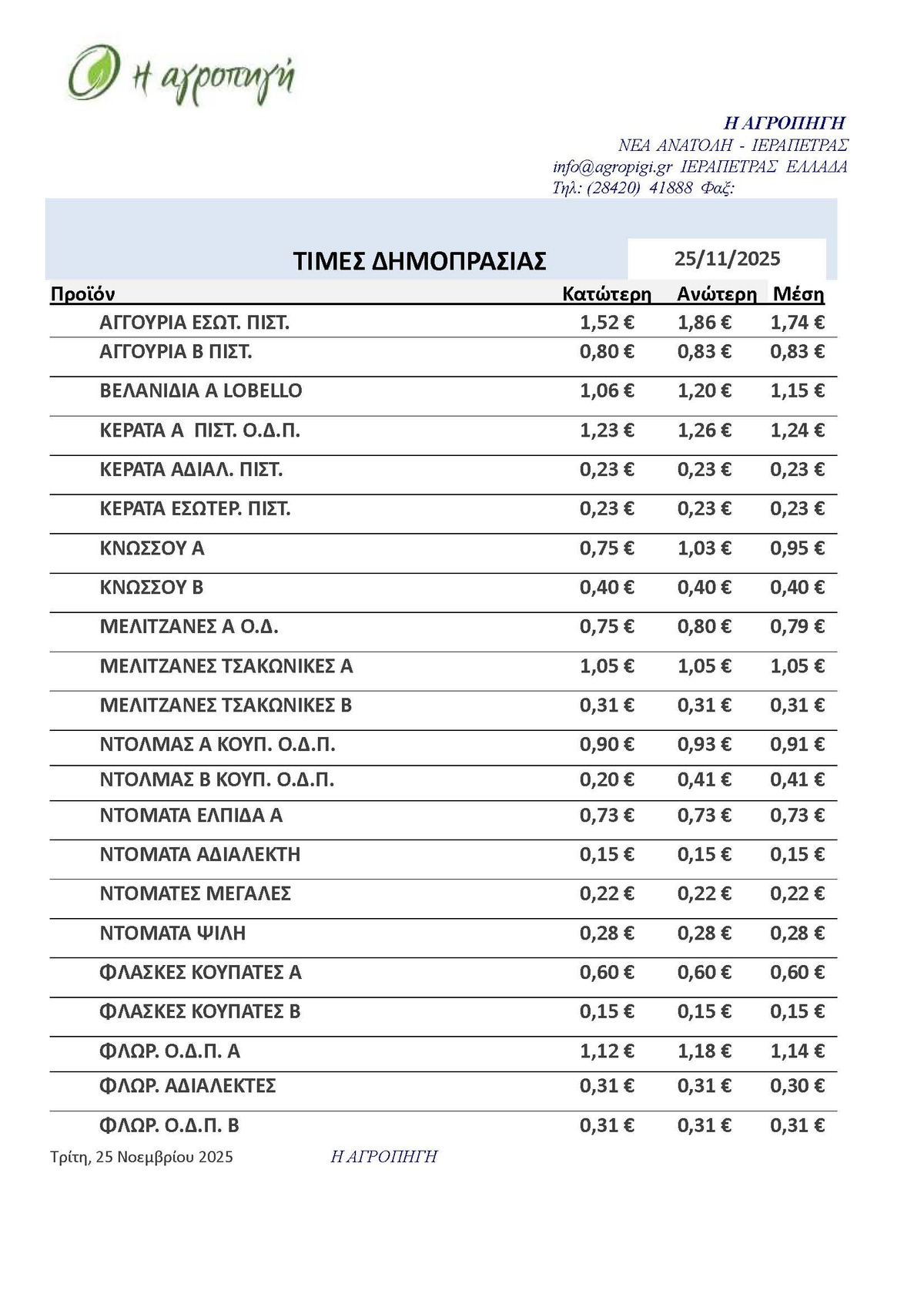 ΤΙΜΕΣ 11:21 π.μ. - 24/11/2025 Τιμές Αγροτικών Προϊόντων 24.11.2025 ΙΕΡΑΠΕΤΡΑ, ΤΙΜΕΣ ΑΓΡΟΤΙΚΩΝ ΠΡΟΙΟΝΤΩΝ , ΔΗΜΟΠΡΑΤΗΡΙΟ, ΚΗΠΕΥΤΙΚΑ Δείτε τις σημερινές τιμές του δημοπρατηρίου