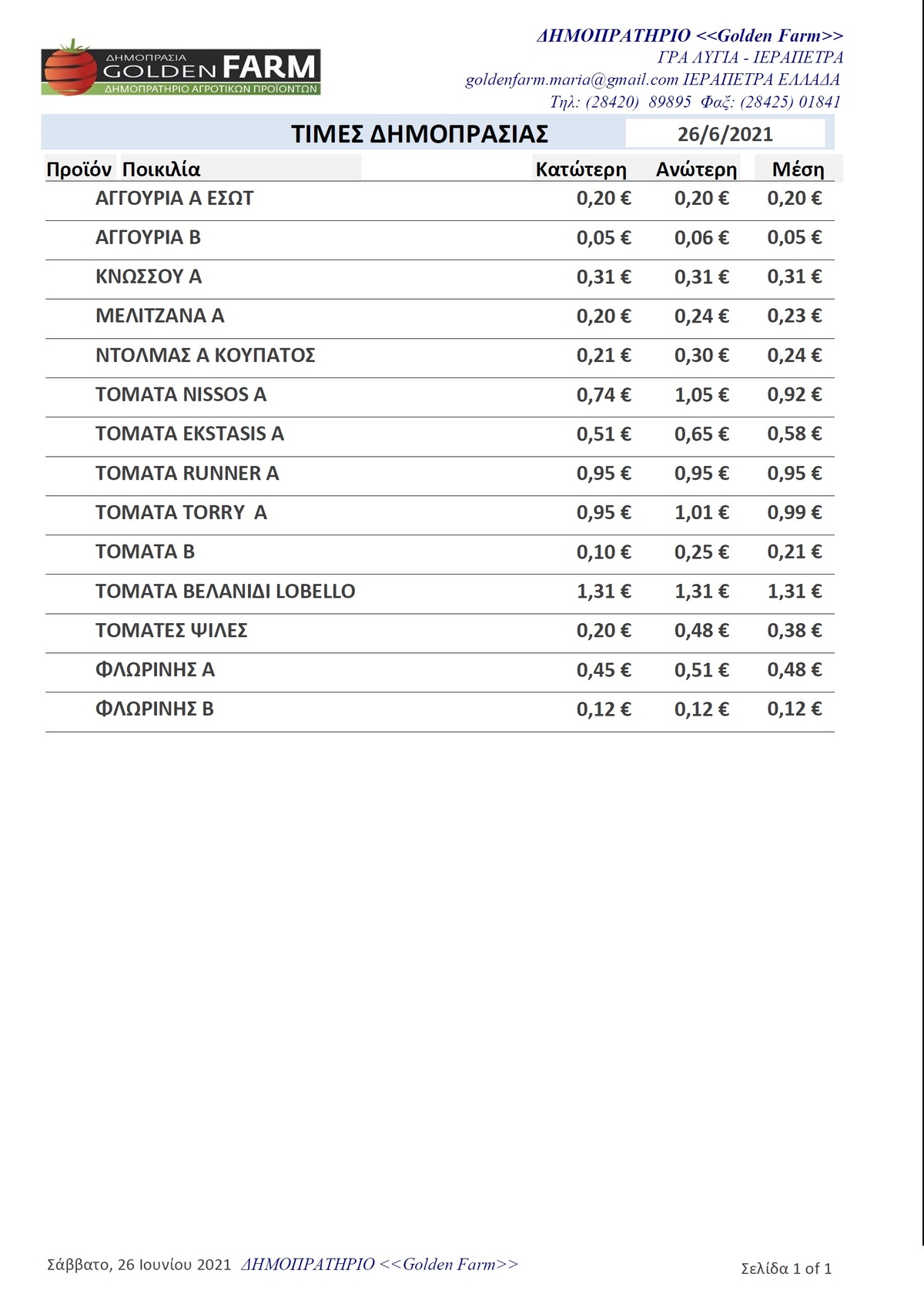 Τιμές Αγροτικών Προϊόντων 26.06.2021 ΙΕΡΑΠΕΤΡΑ 1:36 μ.μ. - Σάββατο 26 Ιουνίου 2021 01:06 μ.μ. - Σάβ, 26/36/2021 ΙΕΡΑΠΕΤΡΑ, ΑΓΡΟΤΙΚΑ, ΤΙΜΕΣ ΑΓΡΟΤΙΚΩΝ ΠΡΟΙΟΝΤΩΝ , GOLDEN FARM Δείτε τιμές δημοπρατηρίων της Ιεράπετρας