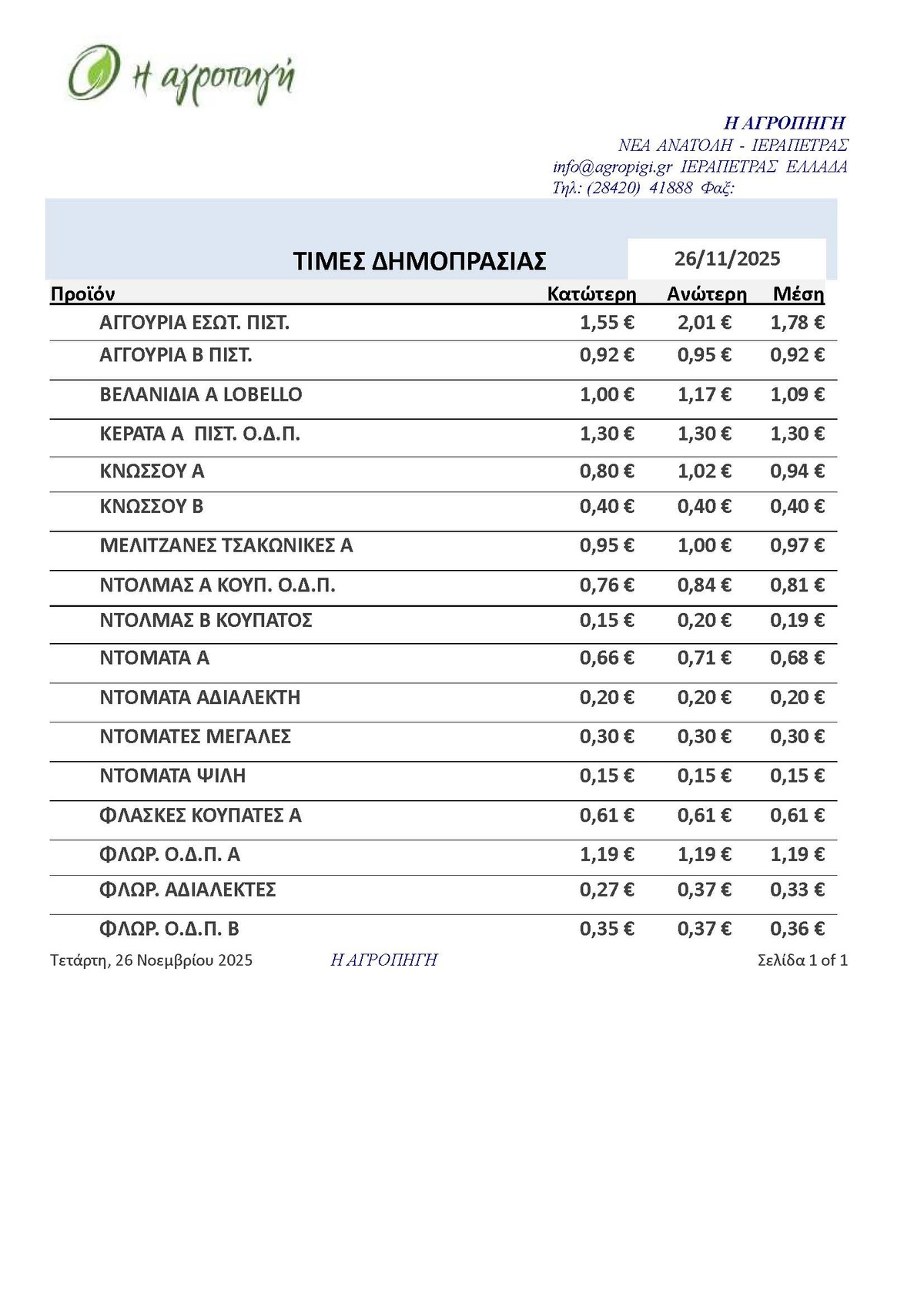 ΤΙΜΕΣ 10:02 π.μ. - 25/11/2025 Τιμές Αγροτικών Προϊόντων 25.11.2025 ΙΕΡΑΠΕΤΡΑ, ΤΙΜΕΣ ΑΓΡΟΤΙΚΩΝ ΠΡΟΙΟΝΤΩΝ , ΔΗΜΟΠΡΑΤΗΡΙΟ, ΚΗΠΕΥΤΙΚΑ Δείτε τις σημερινές τιμές του δημοπρατηρίου