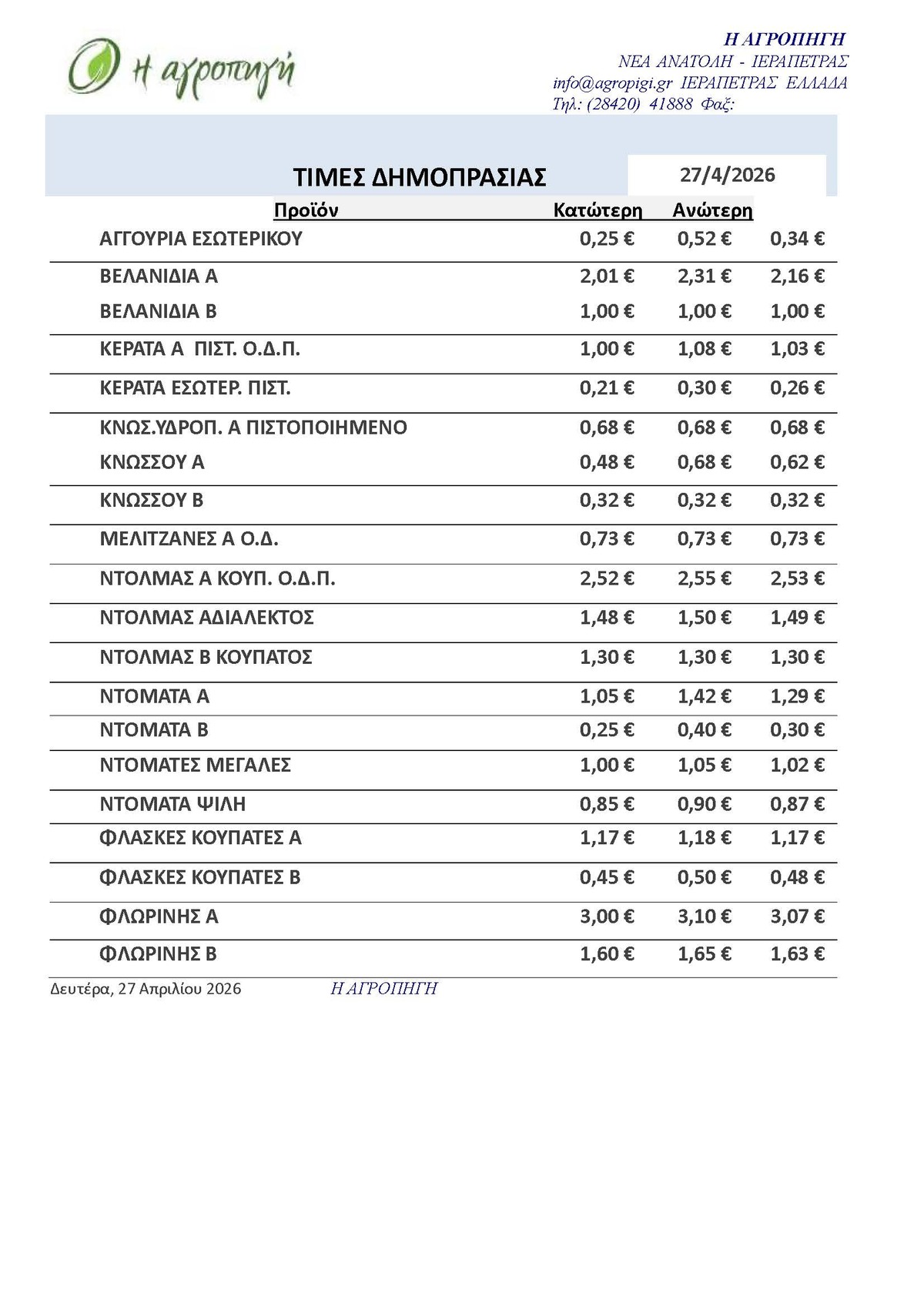 Τιμές Αγροτικών Προϊόντων 27.04.2026 ΤΙΜΕΣ 7:23 π.μ. - Δευτέρα 27 Απριλίου 2026 07:04 π.μ. - Δευ, 27/23/2026 ΙΕΡΑΠΕΤΡΑ, ΤΙΜΕΣ ΑΓΡΟΤΙΚΩΝ ΠΡΟΙΟΝΤΩΝ, ΔΗΜΟΠΡΑΤΗΡΙΟ, ΚΗΠΕΥΤΙΚΑ Δείτε τις σημερινές τιμές του δημοπρατηρίου