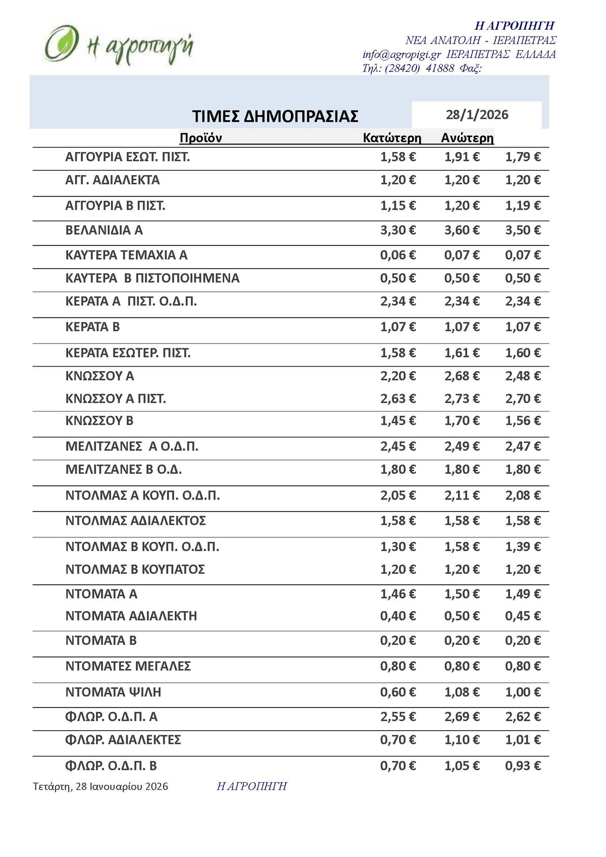 Τιμές Αγροτικών Προϊόντων 28.01.2026 ΤΙΜΕΣ 8:16 π.μ. - Τετάρτη 28 Ιανουαρίου 2026 08:01 π.μ. - Τετ, 28/16/2026 ΙΕΡΑΠΕΤΡΑ, ΤΙΜΕΣ ΑΓΡΟΤΙΚΩΝ ΠΡΟΙΟΝΤΩΝ , ΔΗΜΟΠΡΑΤΗΡΙΟ, ΚΗΠΕΥΤΙΚΑ Δείτε τις σημερινές τιμές του δημοπρατηρίου