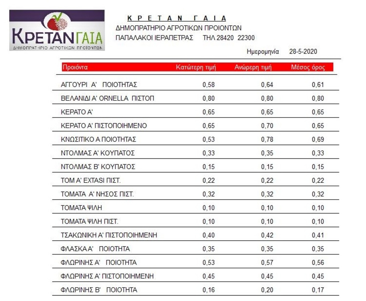 ΤΙΜΕΣ 08:01 π.μ. - 30/03/2026 Τιμές Αγροτικών Προϊόντων 30.03.2026 ΙΕΡΑΠΕΤΡΑ, ΤΙΜΕΣ ΑΓΡΟΤΙΚΩΝ ΠΡΟΙΟΝΤΩΝ , ΔΗΜΟΠΡΑΤΗΡΙΟ, ΚΗΠΕΥΤΙΚΑ Δείτε τις σημερινές τιμές του δημοπρατηρίου