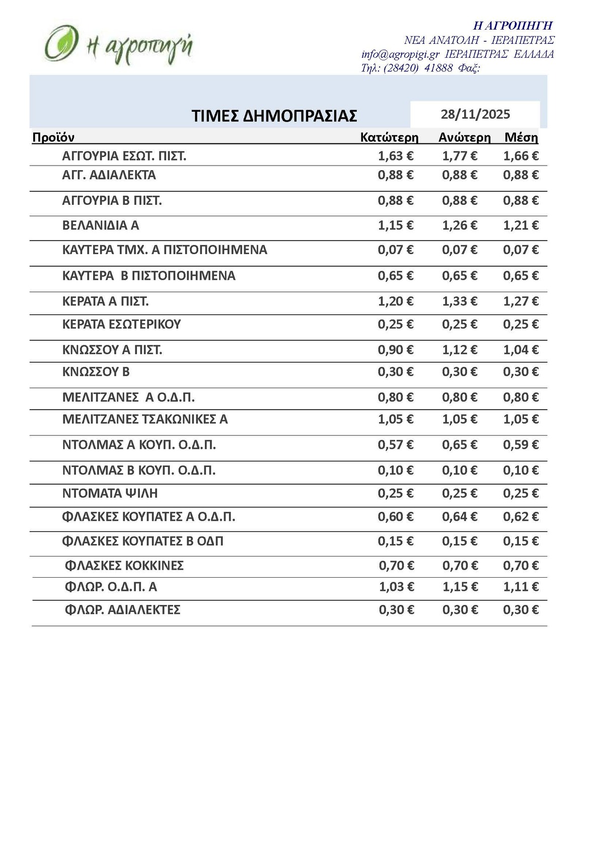 Τιμές Αγροτικών Προϊόντων 28.11.2025 ΤΙΜΕΣ 10:12 π.μ. - Παρασκευή, 28 Νοεμβρίου 2025 10:11 π.μ. - Παρ, 28/12/2025 ΙΕΡΑΠΕΤΡΑ, ΤΙΜΕΣ ΑΓΡΟΤΙΚΩΝ ΠΡΟΙΟΝΤΩΝ , ΔΗΜΟΠΡΑΤΗΡΙΟ, ΚΗΠΕΥΤΙΚΑ Δείτε τις σημερινές τιμές του δημοπρατηρίου