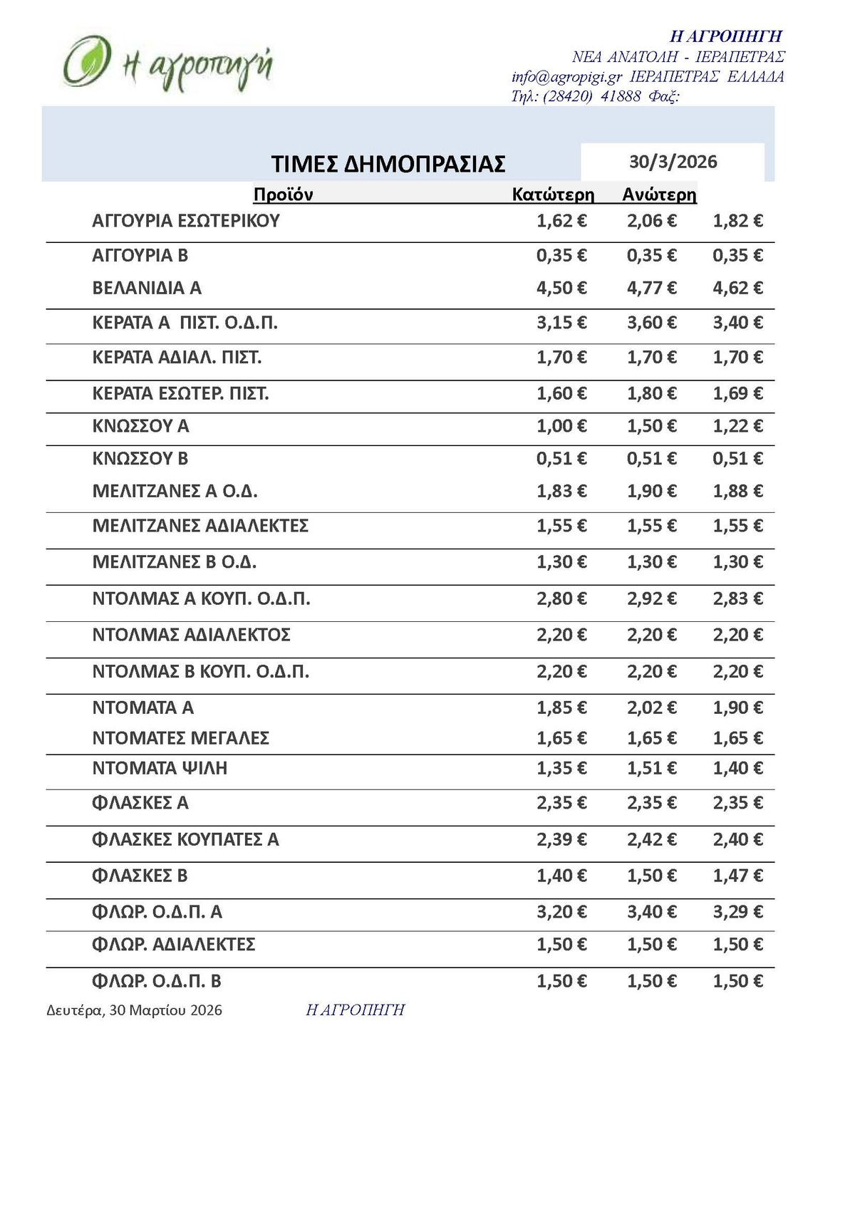 Τιμές Αγροτικών Προϊόντων 30.03.2026 ΤΙΜΕΣ 8:01 π.μ. - Δευτέρα 30 Μαρτίου 2026 08:03 π.μ. - Δευ, 30/01/2026 ΙΕΡΑΠΕΤΡΑ, ΤΙΜΕΣ ΑΓΡΟΤΙΚΩΝ ΠΡΟΙΟΝΤΩΝ , ΔΗΜΟΠΡΑΤΗΡΙΟ, ΚΗΠΕΥΤΙΚΑ Δείτε τις σημερινές τιμές του δημοπρατηρίου