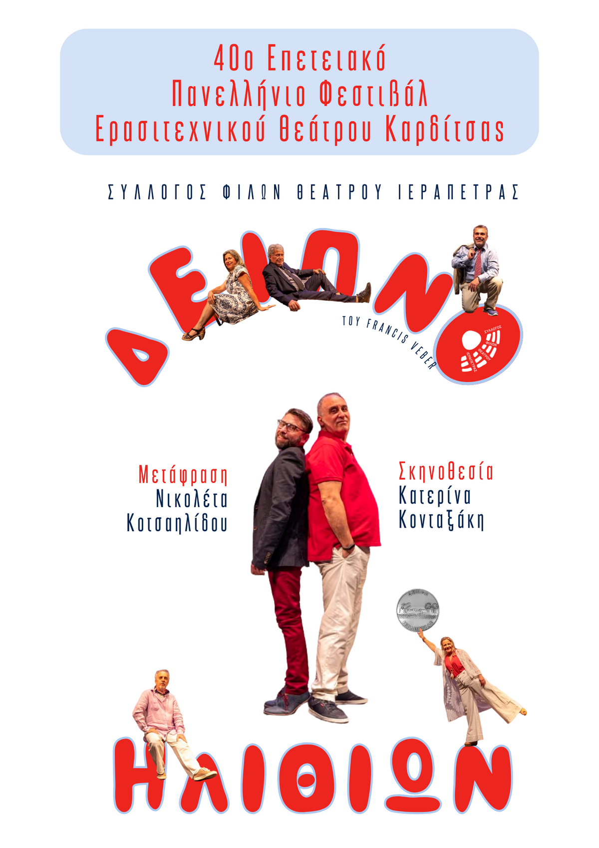 Ο Σύλλογος Φίλων Θεάτρου Ιεράπετρας ταξιδεύει στις αρχές Μαρτίου στην πόλη της Καρδίτσας. Η επιτυχημένη θεατρική παράσταση του συλλόγου, “Δείπνο Ηλιθίων”, του Francis Veber, σε μετάφραση Νικολέτας Κοτσαϊλίδου και σε σκηνοθεσία Κατερίνας Κονταξάκη, βρίσκεται στην λίστα με τις οκτώ παραστάσεις ερασιτεχνικών ομάδων, απο όλη την Ελλάδα, που θα λάβουν μέρος στο 40ο Επετειακό Πανελλήνιο Φεστιβάλ Ερασιτεχνικού Θεάτρου Καρδίτσας.