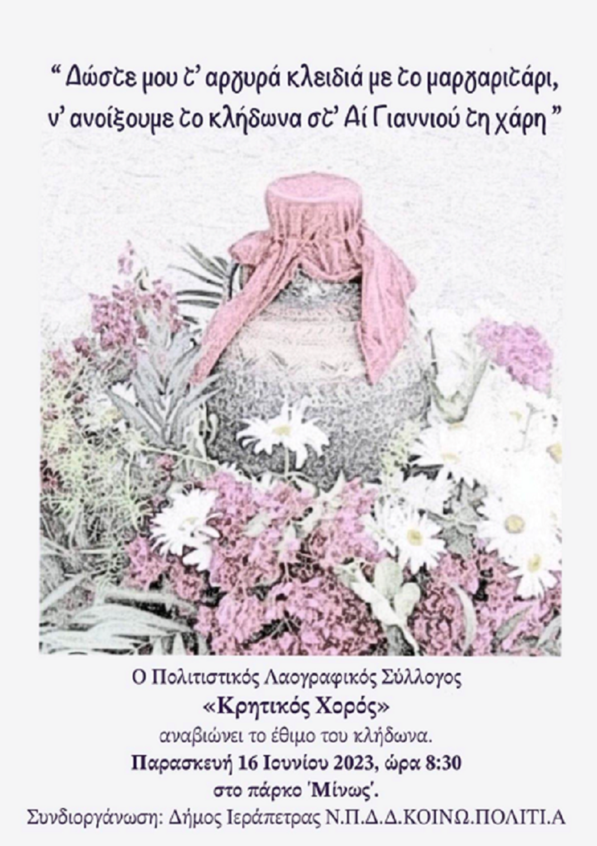 Tο έθιμο του κλήδωνα αναβιώνει o Πολιτιστικός Λαογραφικός Σύλλογος «Κρητικός Χορός» ΛΑΣΙΘΙ ΙΕΡΑΠΕΤΡΑ 11:59 π.μ. - Πέμπτη 15 Ιουνίου 2023 11:06 π.μ. - Πέμ, 15/59/2023 ΙΕΡΑΠΕΤΡΑ, ΚΟΙΝΩ.ΠΟΛΙΤΙ.Α., ΜΙΝΩΣ, ΑΝΑΒΙΩΣΗ ΕΘΙΜΟΥ, ΚΛΗΔΩΝΑΣ Την Παρασκευή 16 Ιουνίου 2023, ώρα 8.30 στο πάρκο «Μίνως» Ο πολιτιστικός Λαογραφικός Σύλλογος «Κρητικός Χορός» αναβιώνει το έθιμο του κλήδωνα.Παρασκευή 16 Ιουνίου 2023, ώρα 8.30 στο πάρκο «Μίνως»Συνδιοργάνωση: Δήμος Ιεράπετρας Ν.Π.Δ.Δ. ΚΟΙΝΩ.ΠΟΛΙΤΙ.Α.