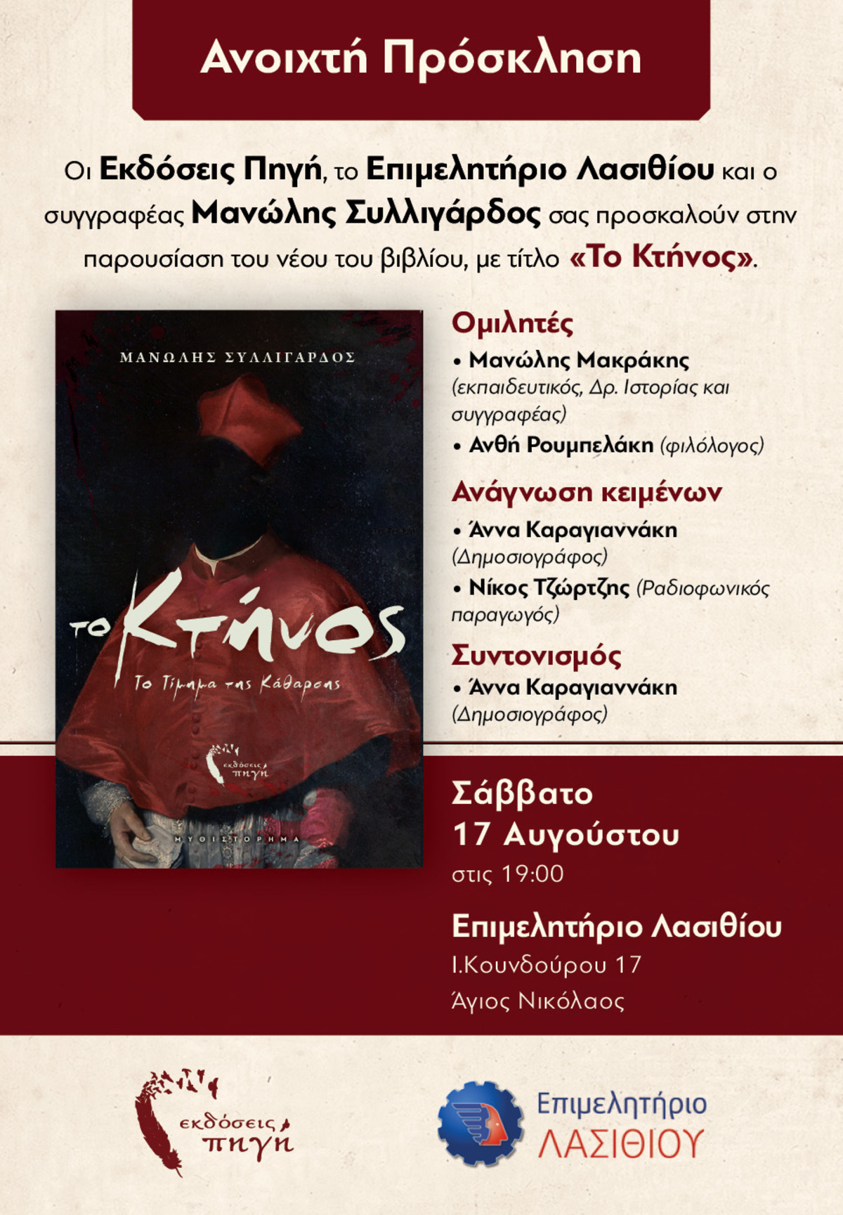 "Το Κτήνος" | Ανοιχτή πρόσκληση στην παρουσίαση του νέου βιβλίου του Μ. Συλλιγάρδου ΛΑΣΙΘΙ ΙΕΡΑΠΕΤΡΑ 9:50 π.μ. - Τρίτη 13 Αυγούστου 2024 09:08 π.μ. - Τρί, 13/50/2024 ΕΠΙΜΕΛΗΤΗΡΙΟ ΛΑΣΙΘΙΟΥ, ΠΑΡΟΥΣΙΑΣΗ ΒΙΒΛΙΟΥ, ΣΥΛΛΙΓΑΡΔΟΣ, ΤΟ ΚΤΗΝΟΣ Το Σάββατο 17 Αυγούστου στο Επιμελητήριο Λασιθίου στις 19:00
